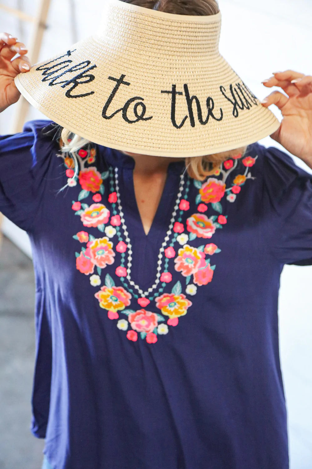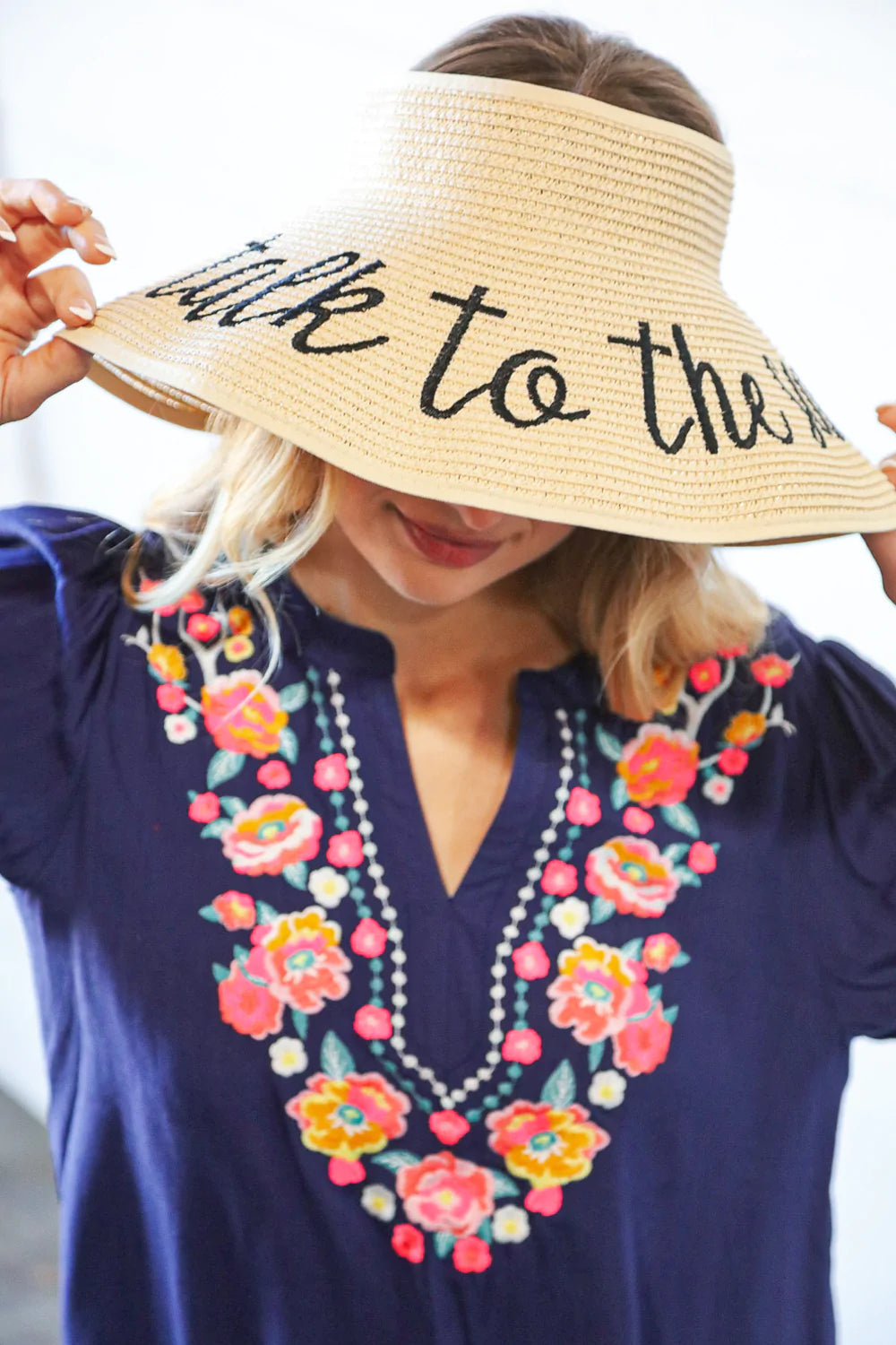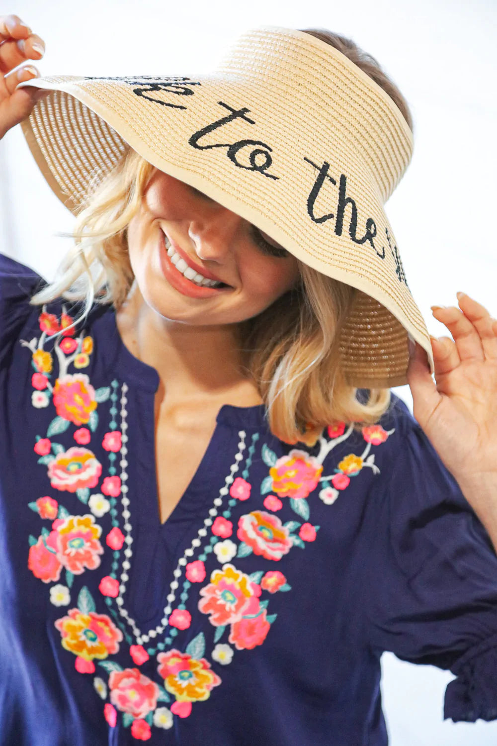Get ready for your beach weekend or tropical vacay with this functional straw hat visor with a whimsical "take to the sand" statement. A Velcro, adjustable bow closure adds charm.