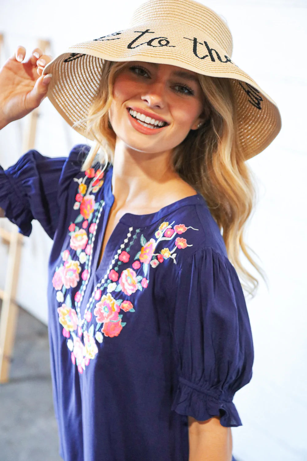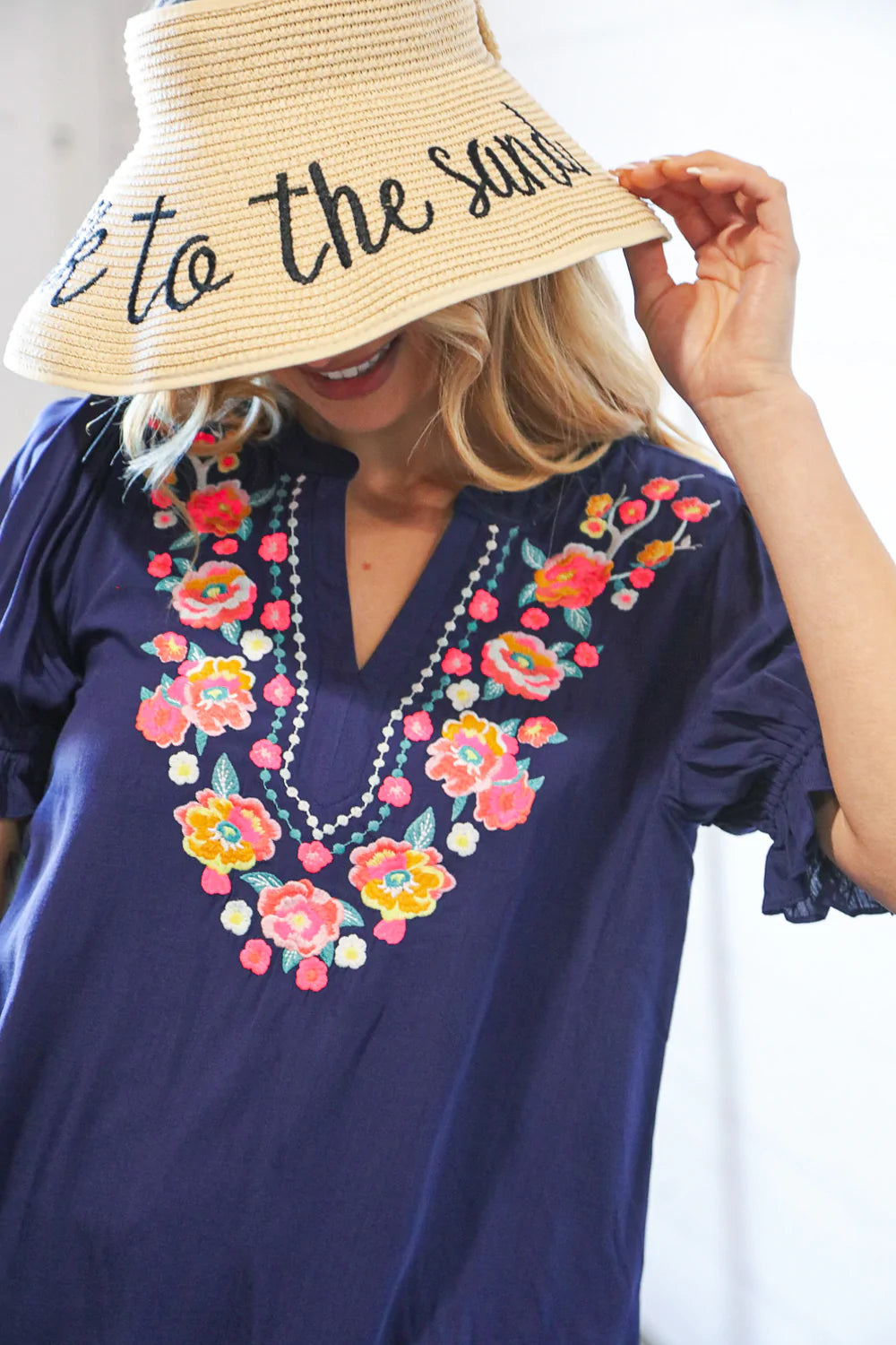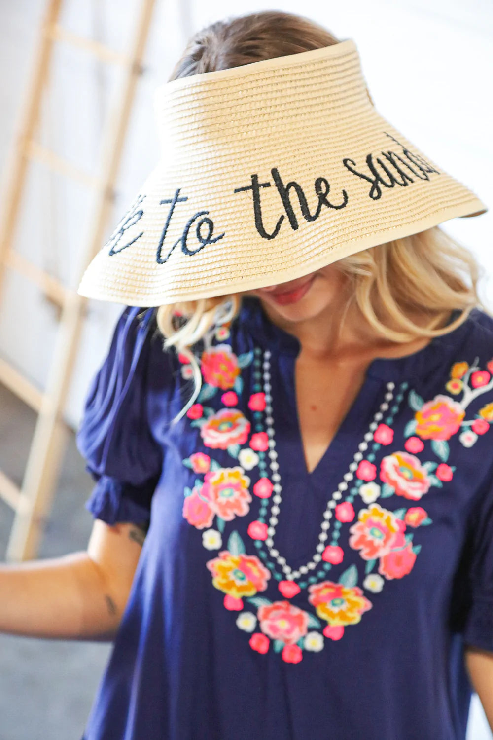 Get ready for your beach weekend or tropical vacay with this functional straw hat visor with a whimsical "take to the sand" statement. A Velcro, adjustable bow closure adds charm.