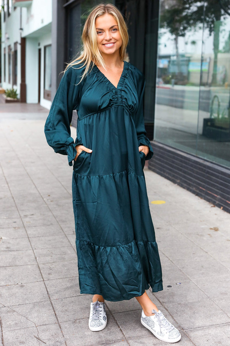 Elegant Hunter Green Elastic V Neck Tiered Satin Maxi Dress