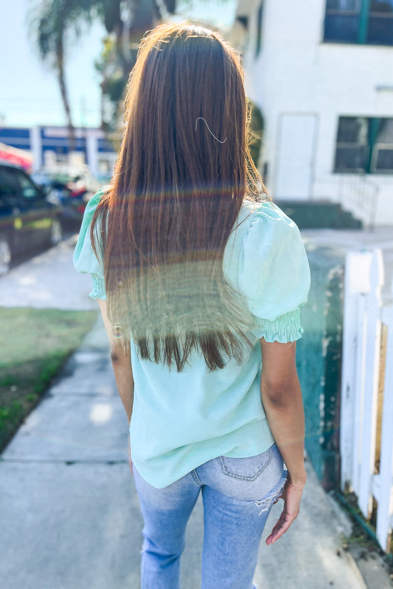 Elegant You Mint Frill Neck Back Button Ruffle Sleeve Blouse
