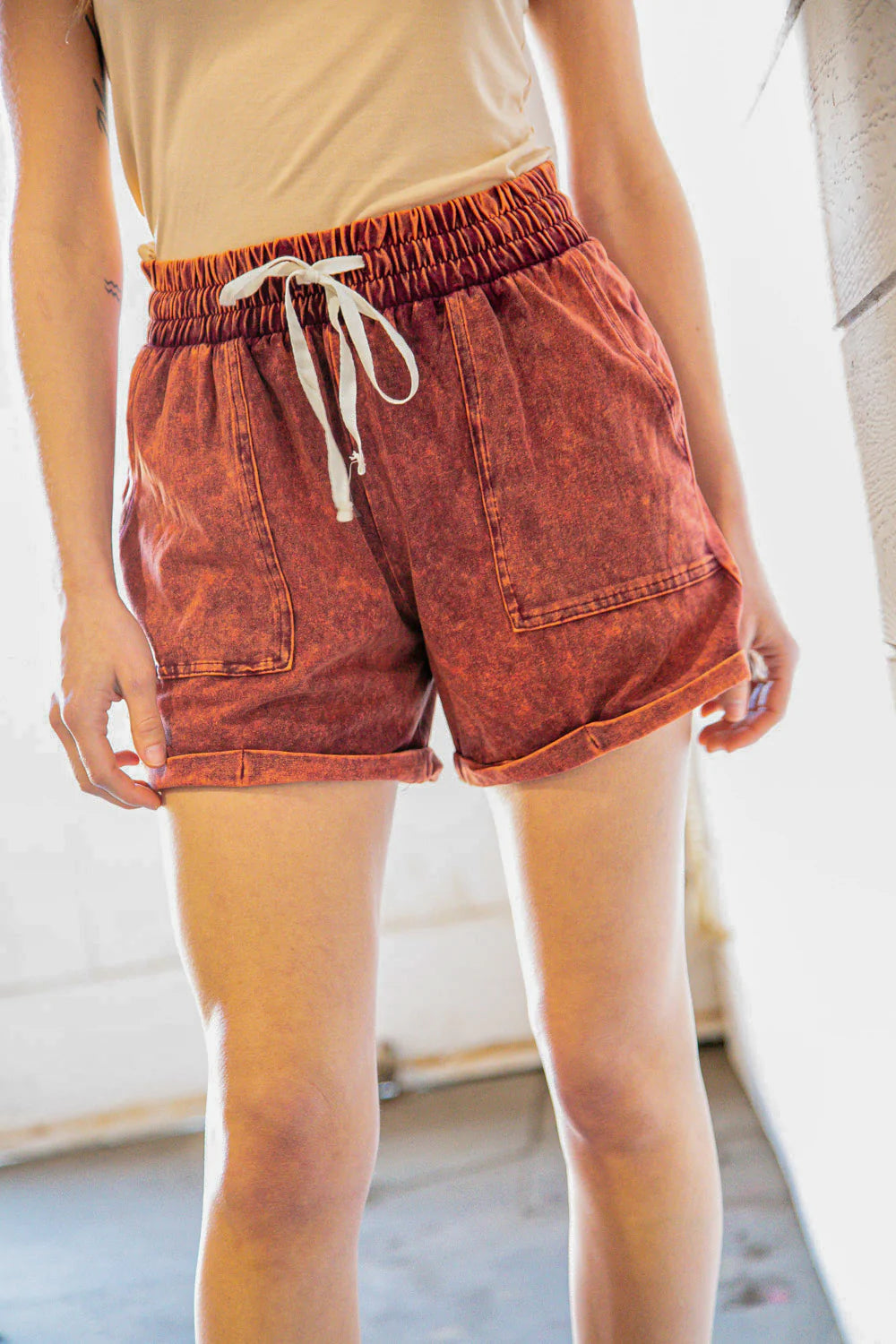 Rust Cotton Light-Wash Drawstring Cuffed Shorts