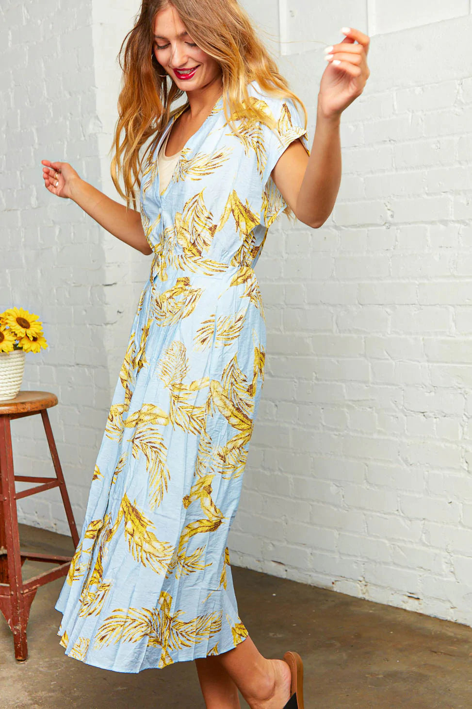 Add glam to your summer ensemble with this light-blue tropical surplice overlay midi dress with functional front buttons and side pockets! Perfectly couture.