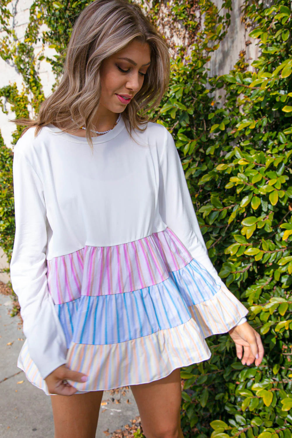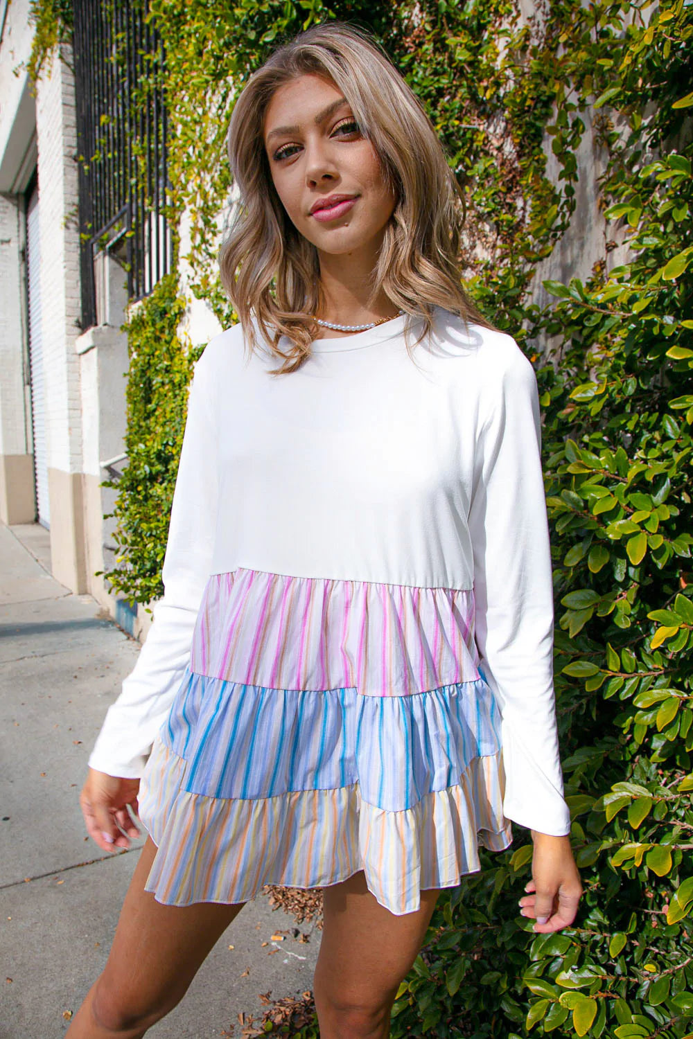 Designed with soft brushed ivory knit, this color block top sports sky blue, rolse and sunflower vertical stripes in a beautifully orchestrated multi-tiered design. Perfect for early spring.