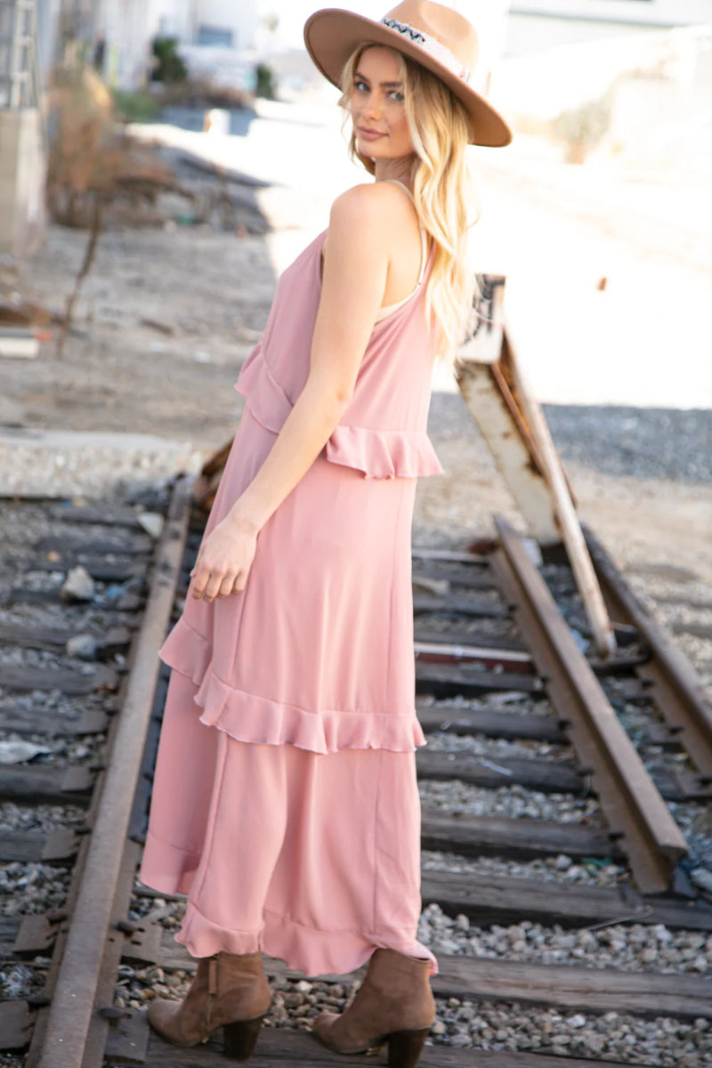 Dusty Rose Halter Neck Hi-Lo Ruffle Tiered Maxi Dress