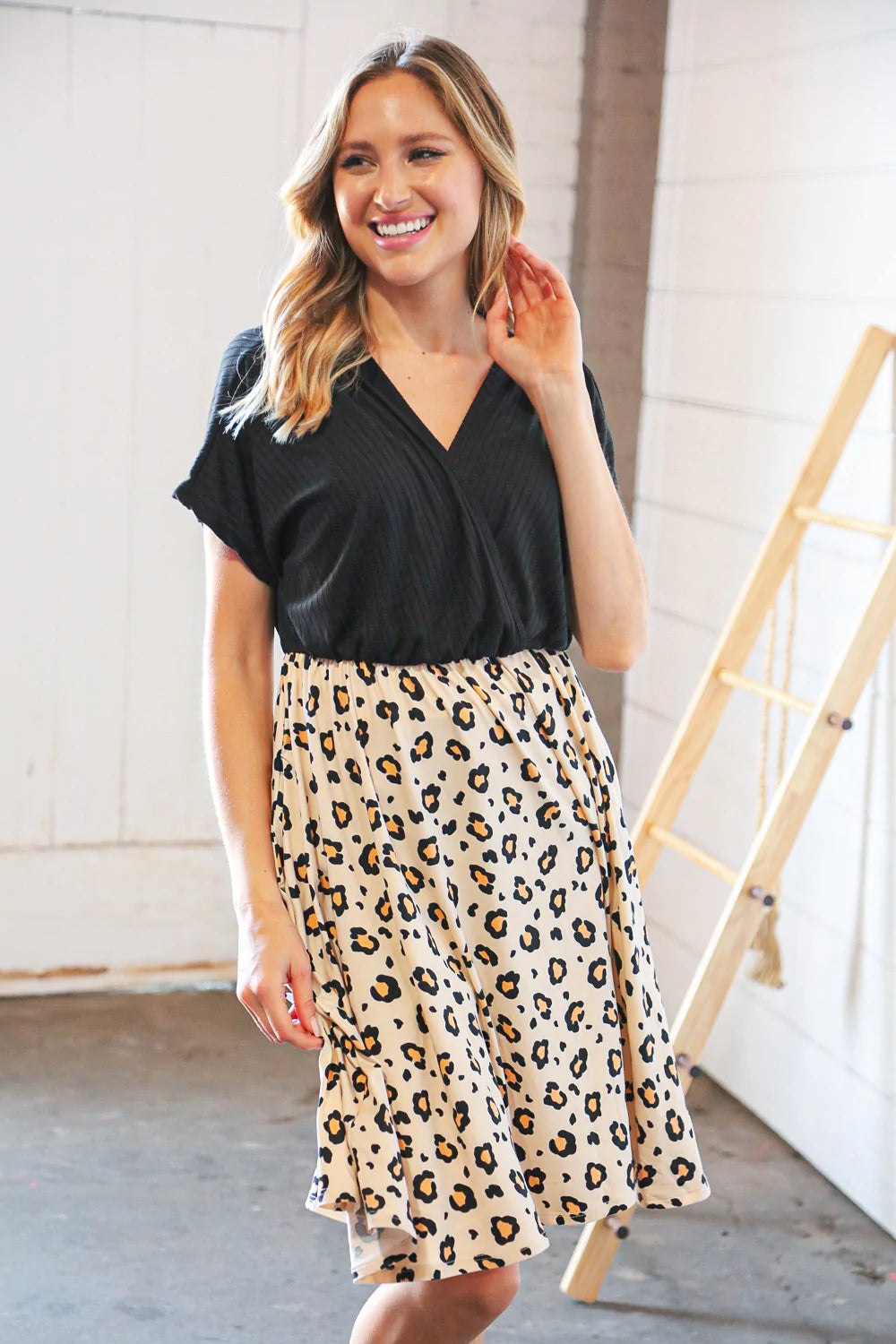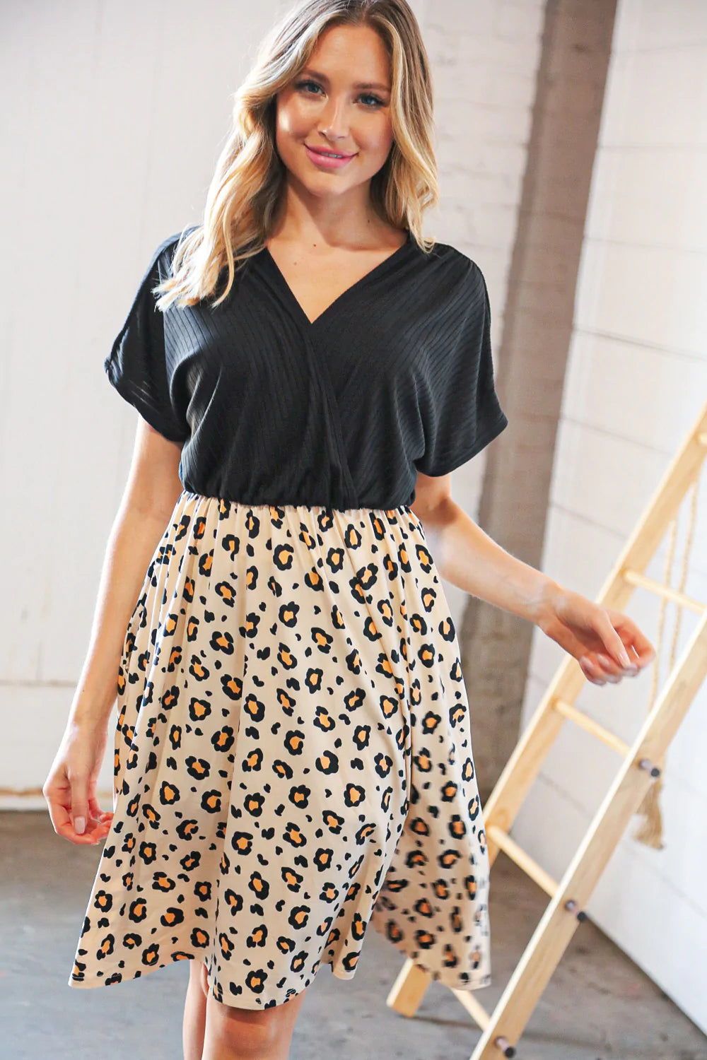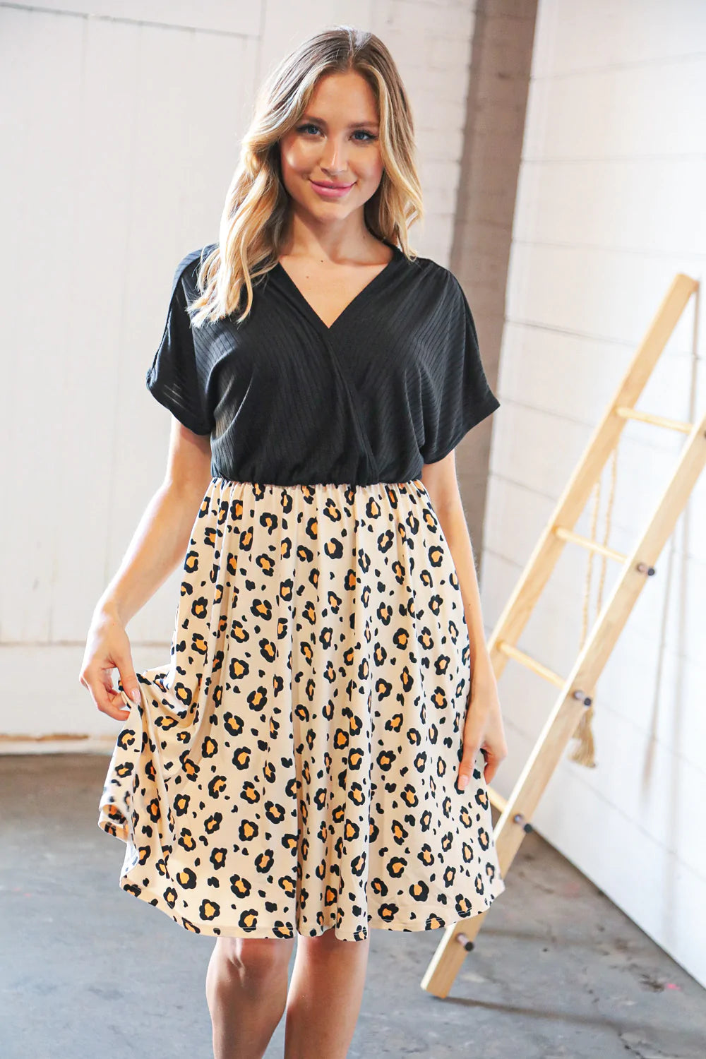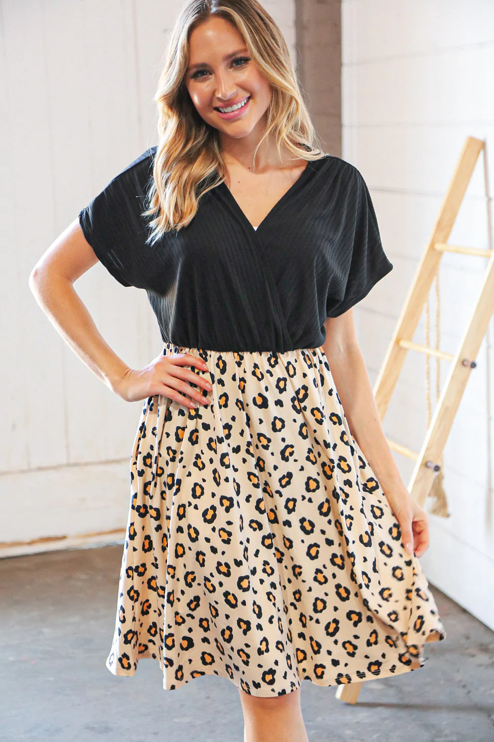 Black Rib Surplice Two Fer Leopard Dress