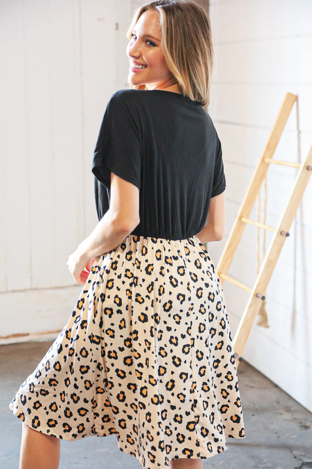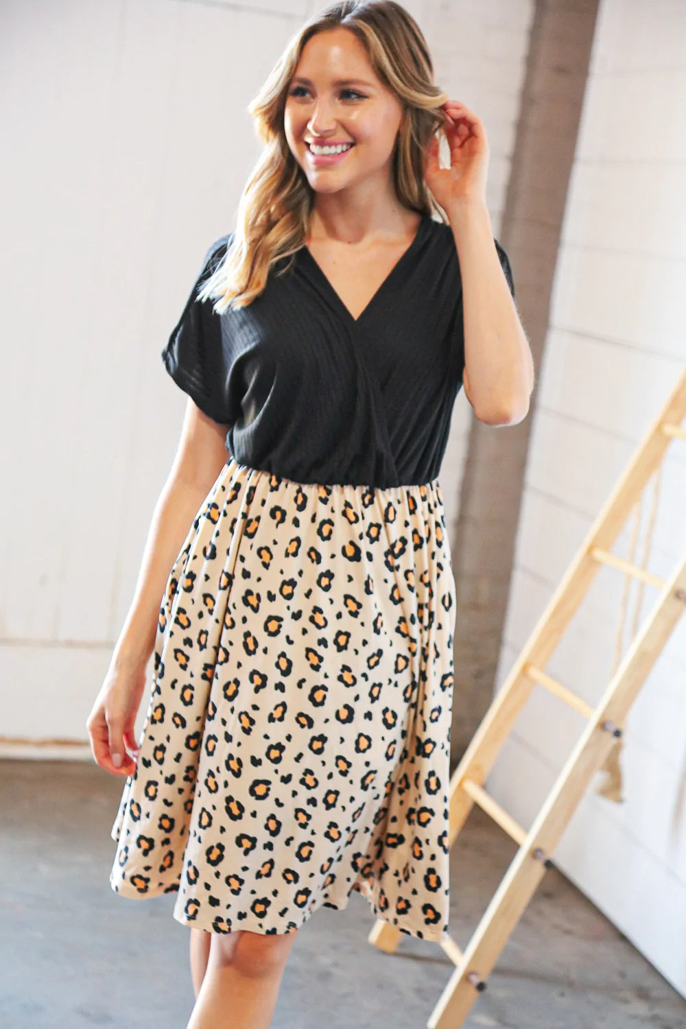 Make a romantic statement with this black rib surplice yoke leopard print dress featuring a two Fer design. With side pockets and a fit and flare hemline, pair with sandals, flats or heels for a stunning look.