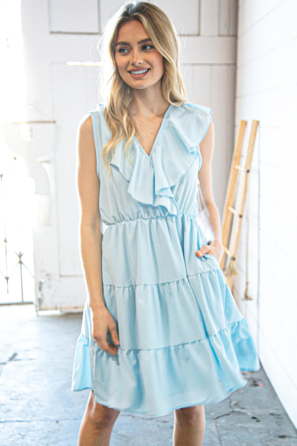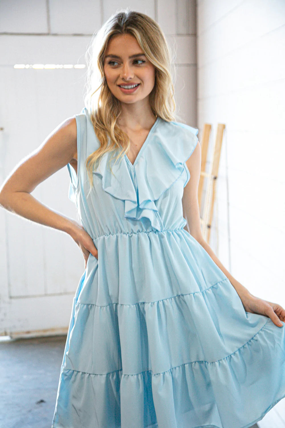 Blue Surplice Tiered Sleeveless Back Bow Woven Dress