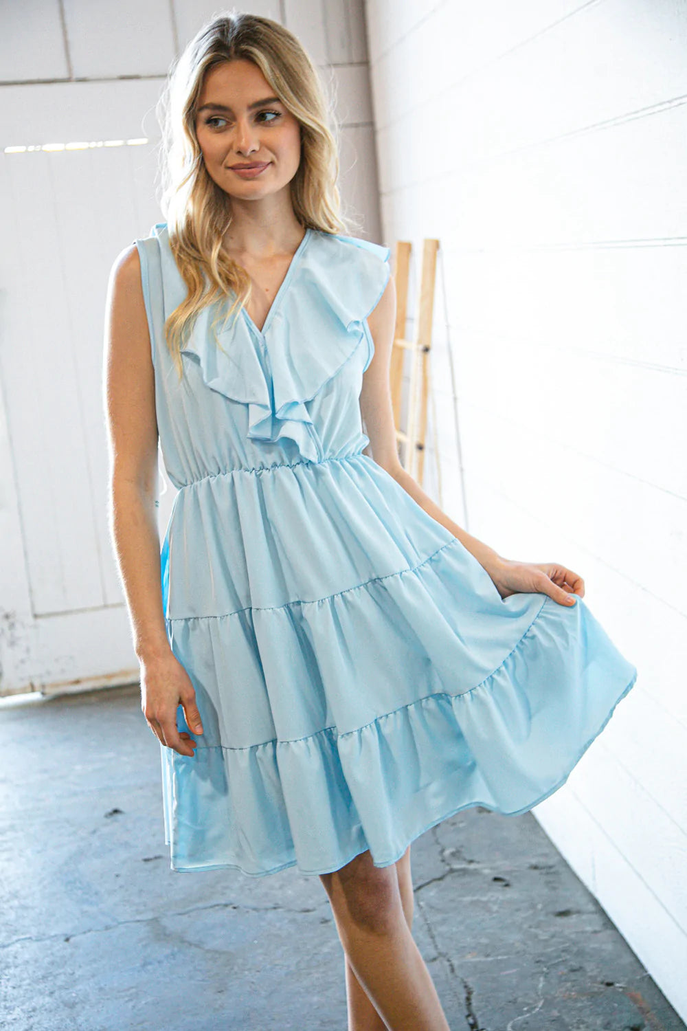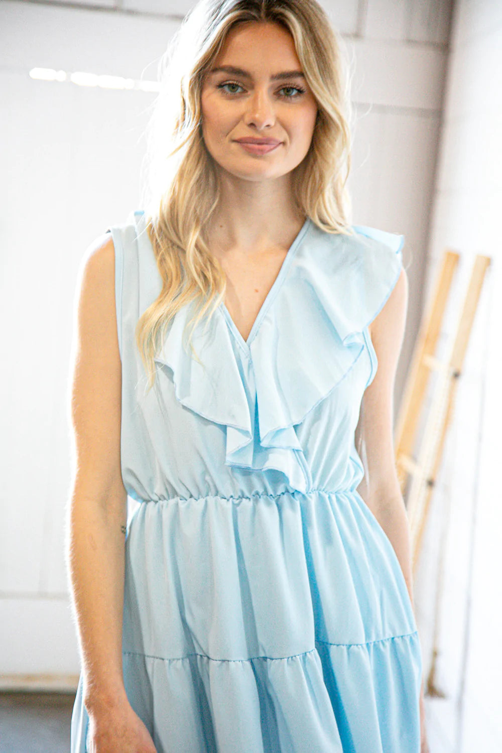 An elastic waist with a beautiful tied back define this chiffon woven ruffle sleeveless dress featuring a square back. With a lining and surplice yoke design for plenty of accessories, turn heads with this stunning dress.