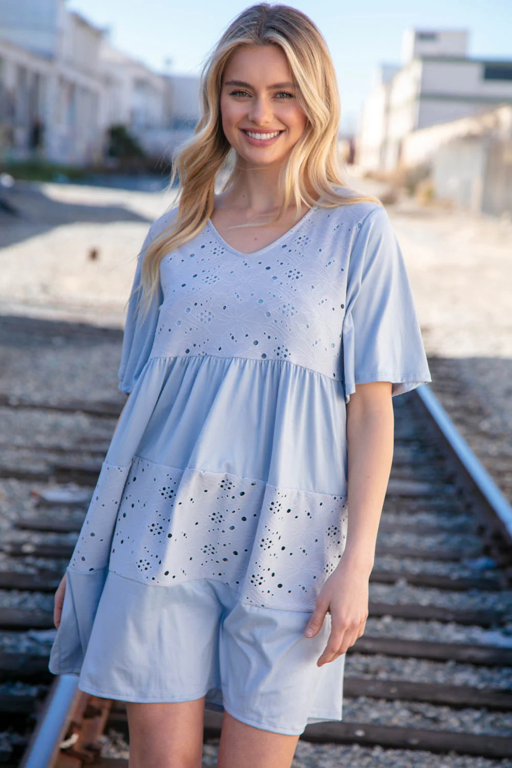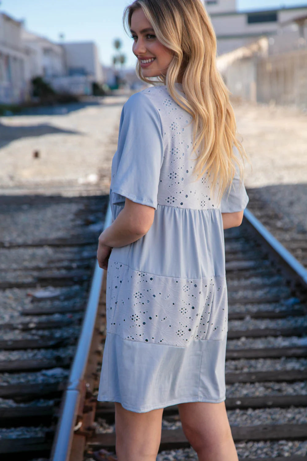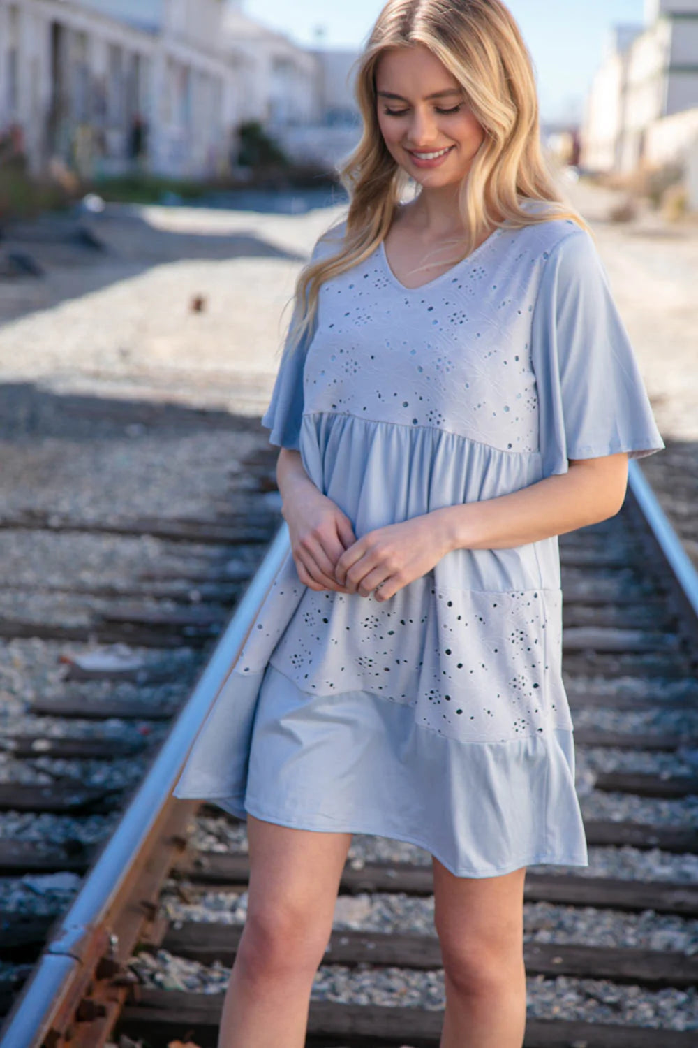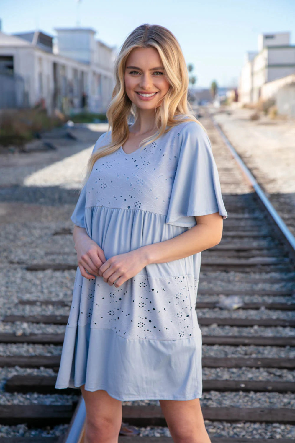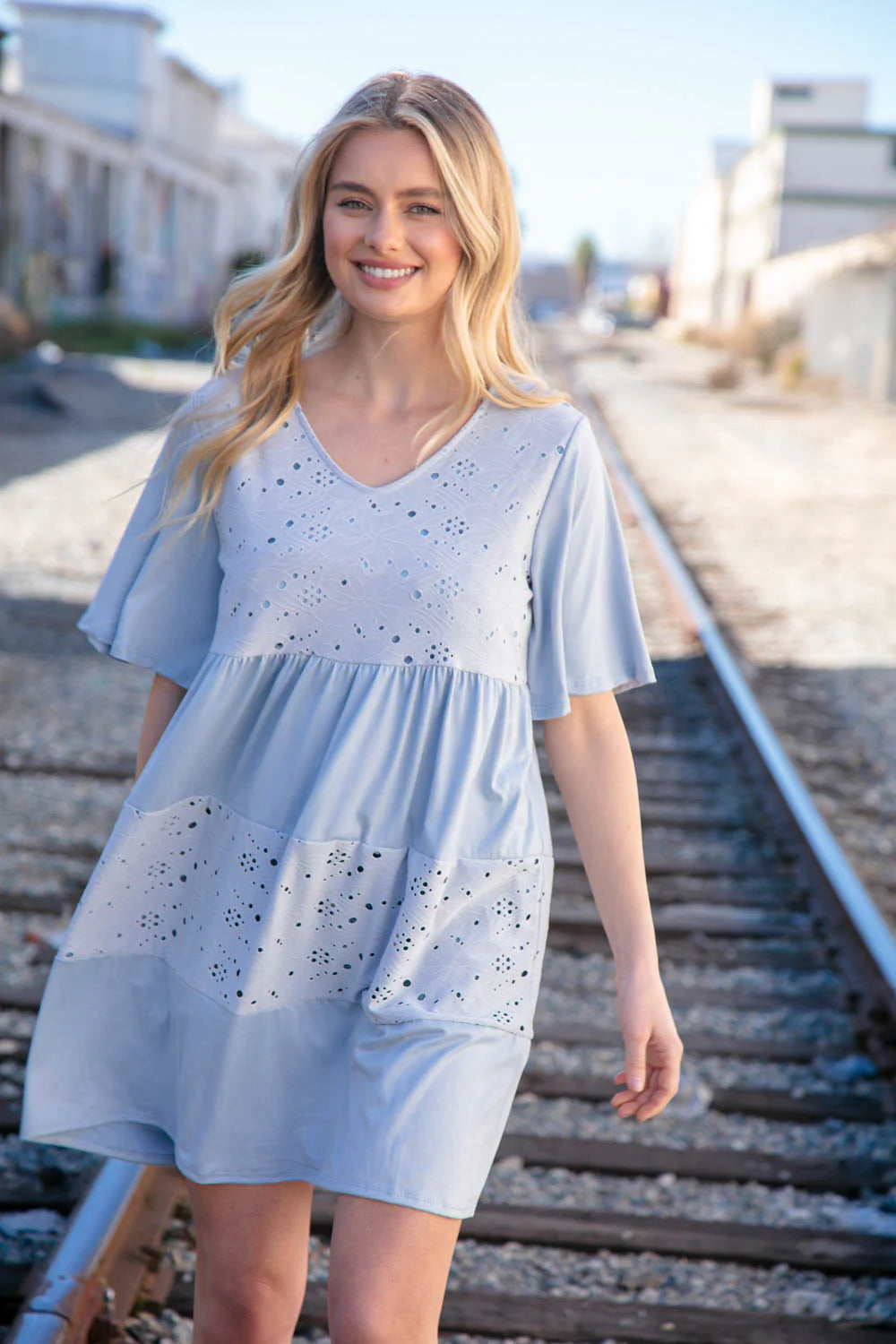 Dusty Blue V Neck Lined Eyelet Knit Flare Flutter Sleeve Dress