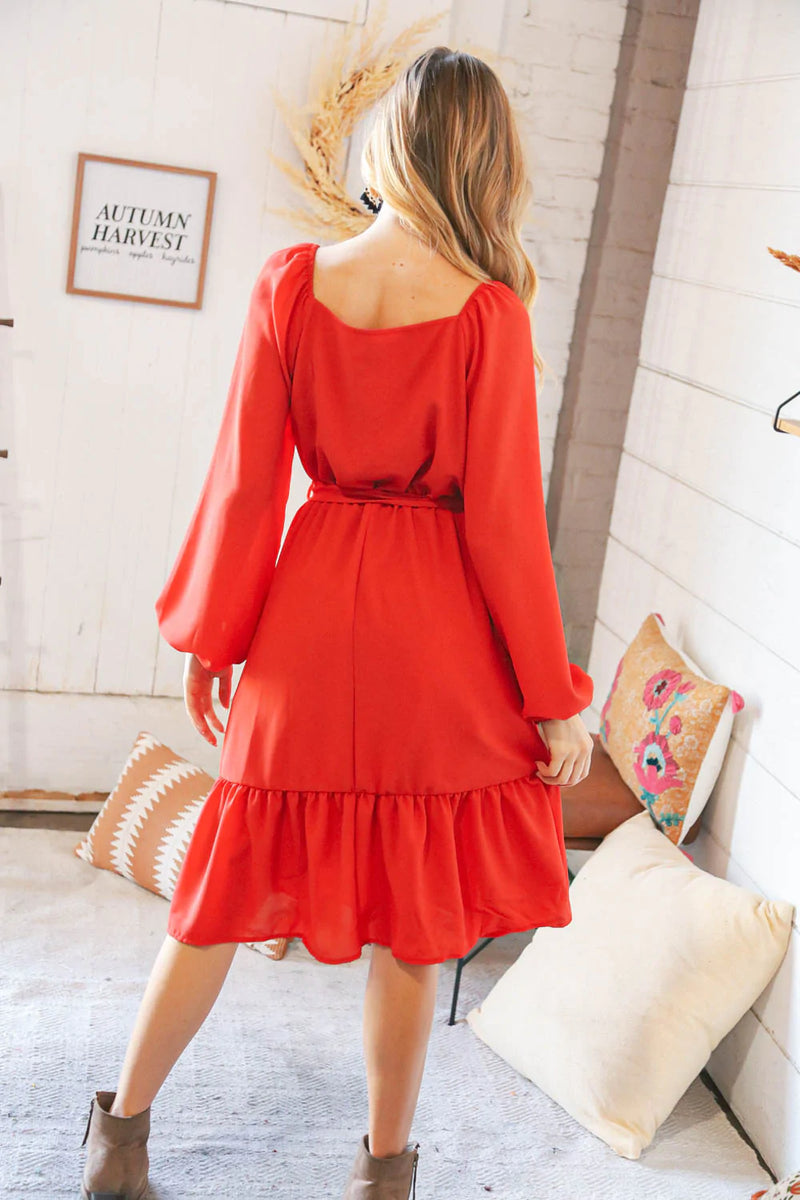 Burnt Orange V Neck Tie Waist Lined Midi Woven Dress