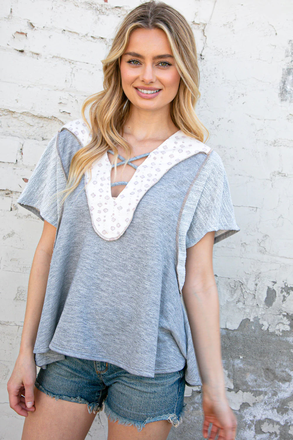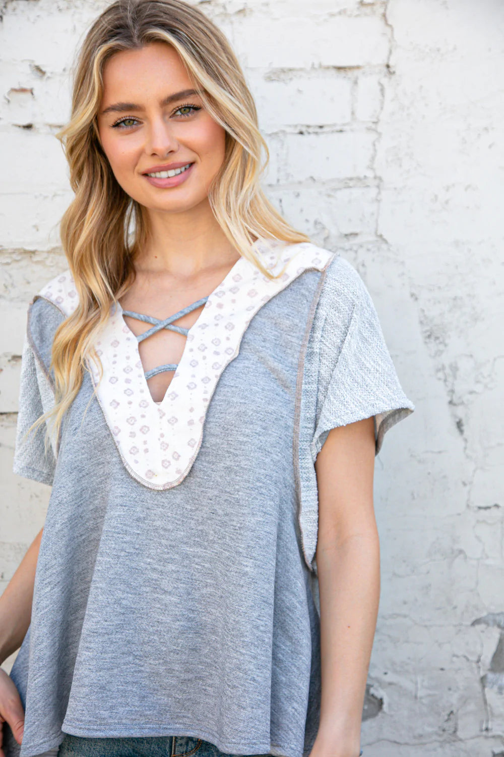 Comfort and style combine in this boho print triblend color block top featuring cozy French terry, a crisscross design and popular out seam overlock reverse stitch details.