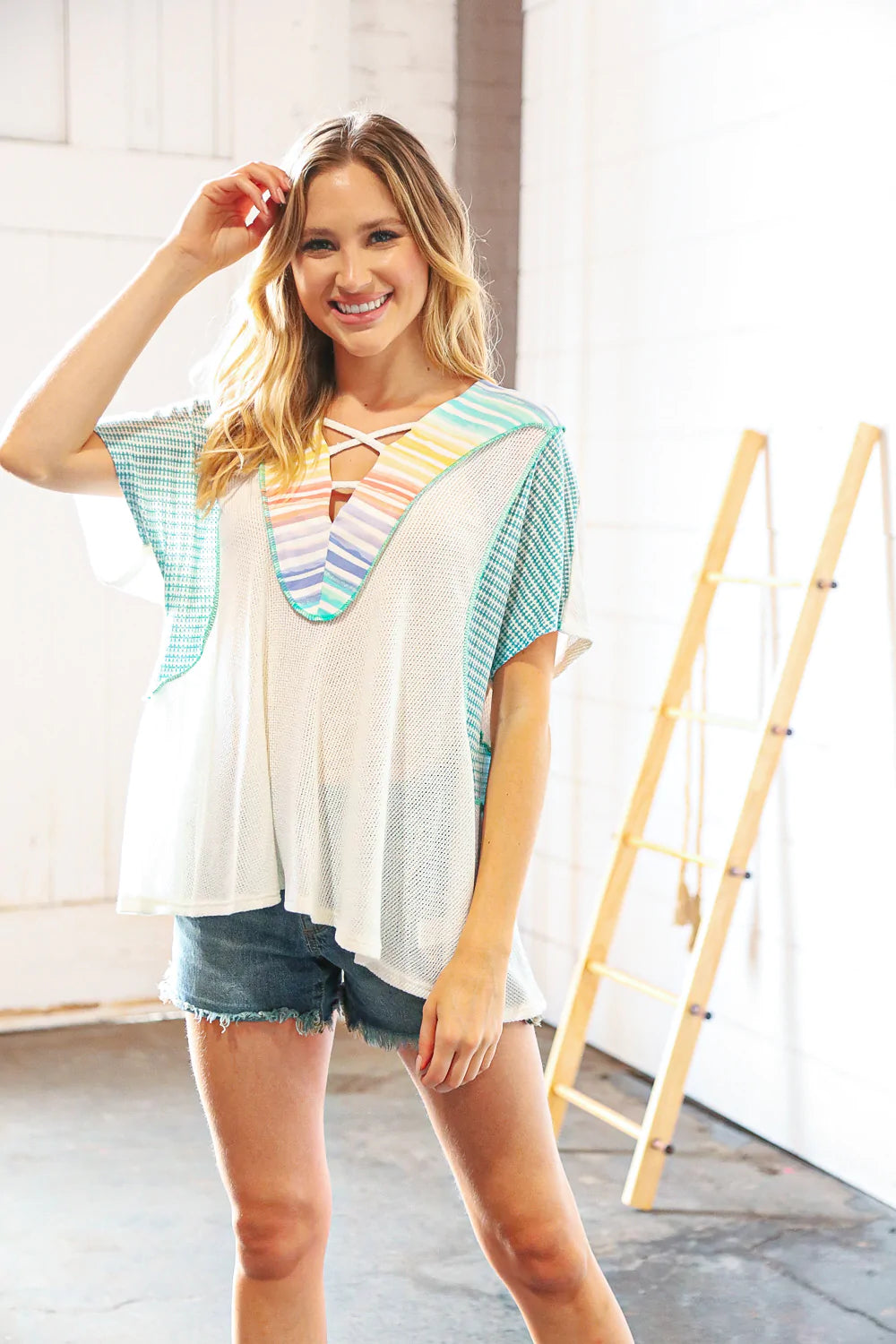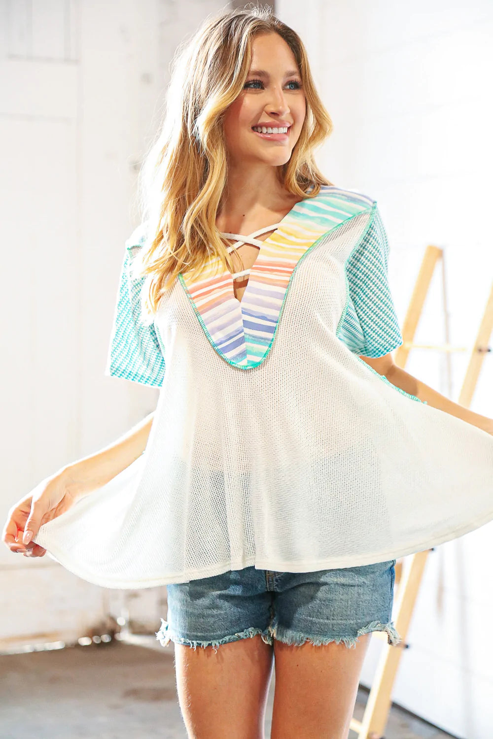 Cream Multi Stripe Lace Up Neck Color Block Top