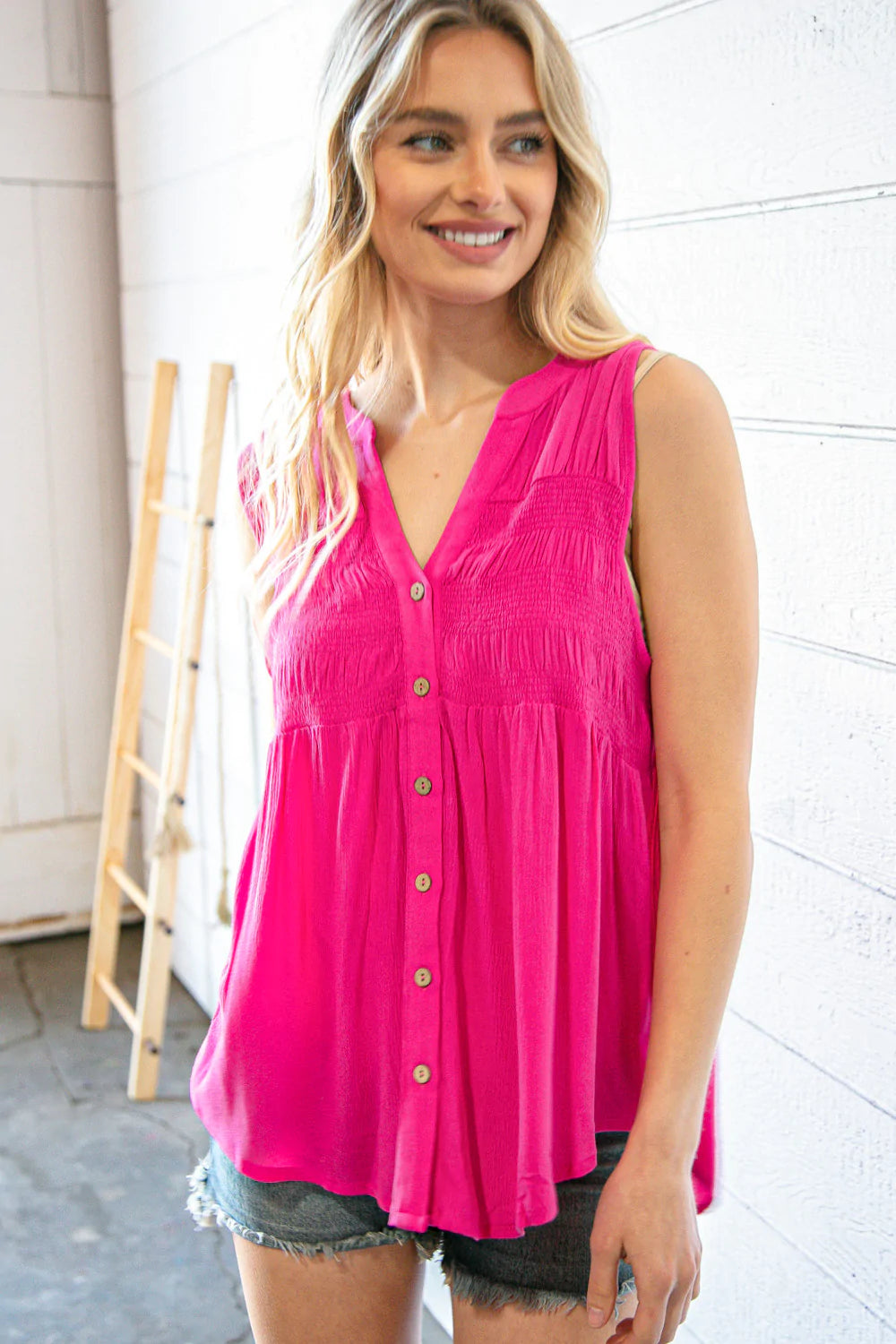 Donning a beautiful silhouette, get instant bob chic in this hot pink sleeveless button-up smocked blouse. With a scalloped hemline and a notched yoke, step into warmer weather in style!