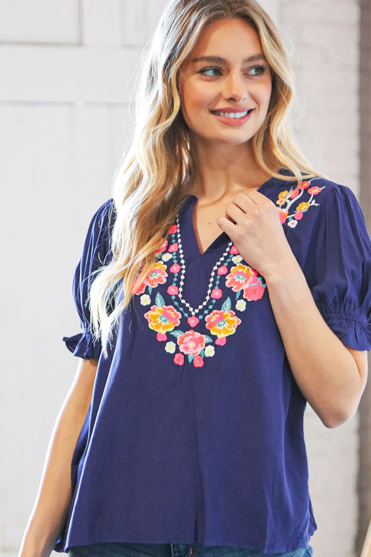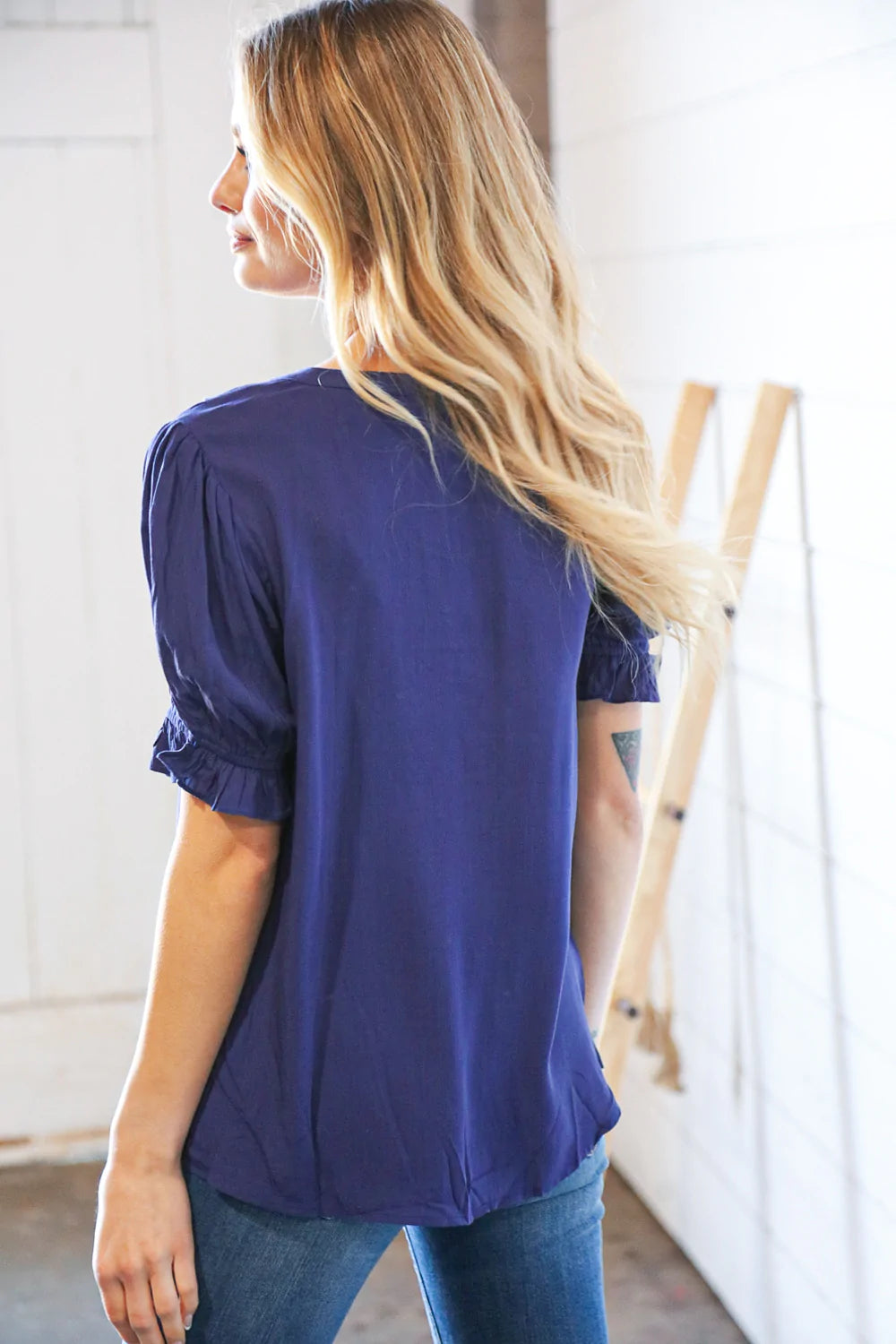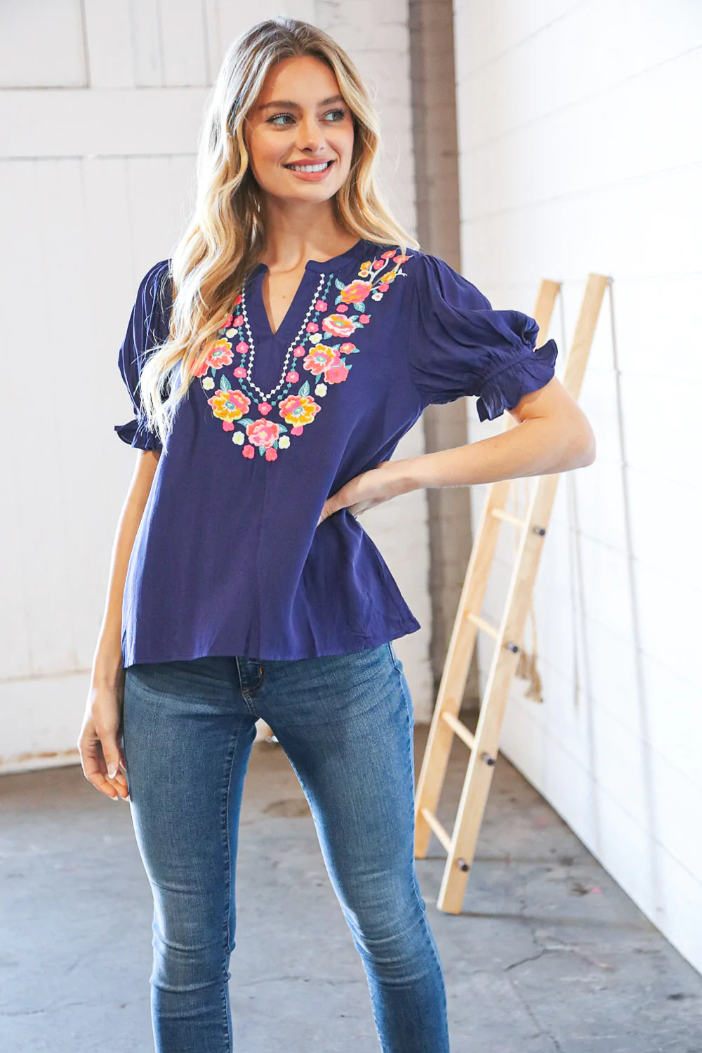 Navy Linen Embroidered Short Bubble Sleeve Top