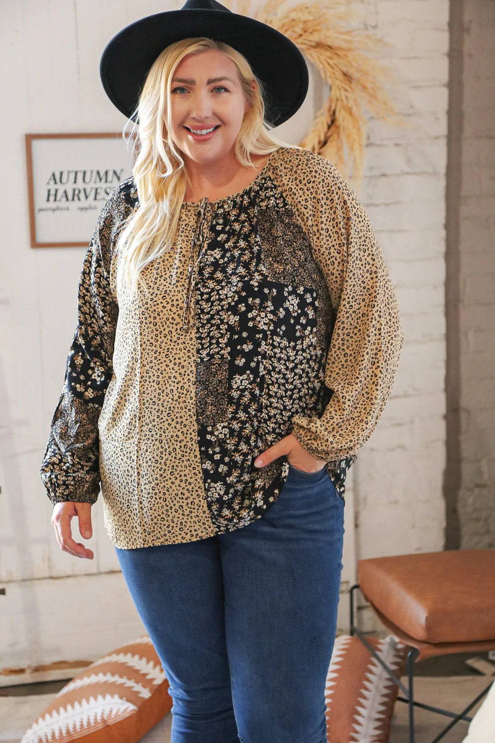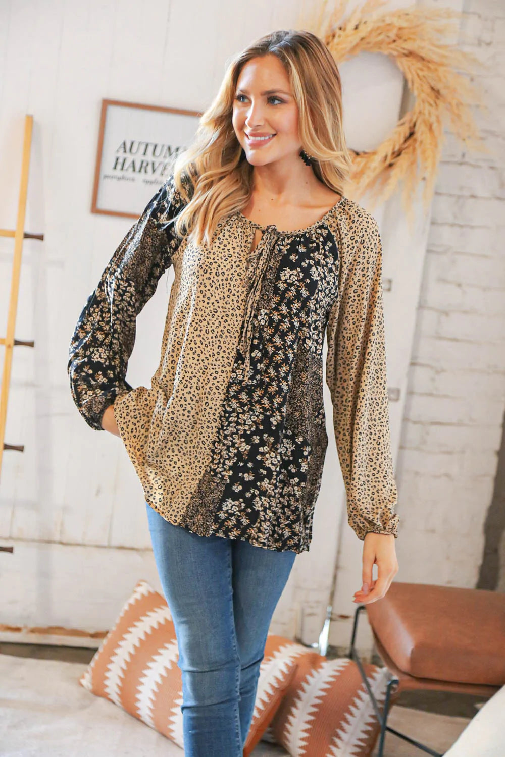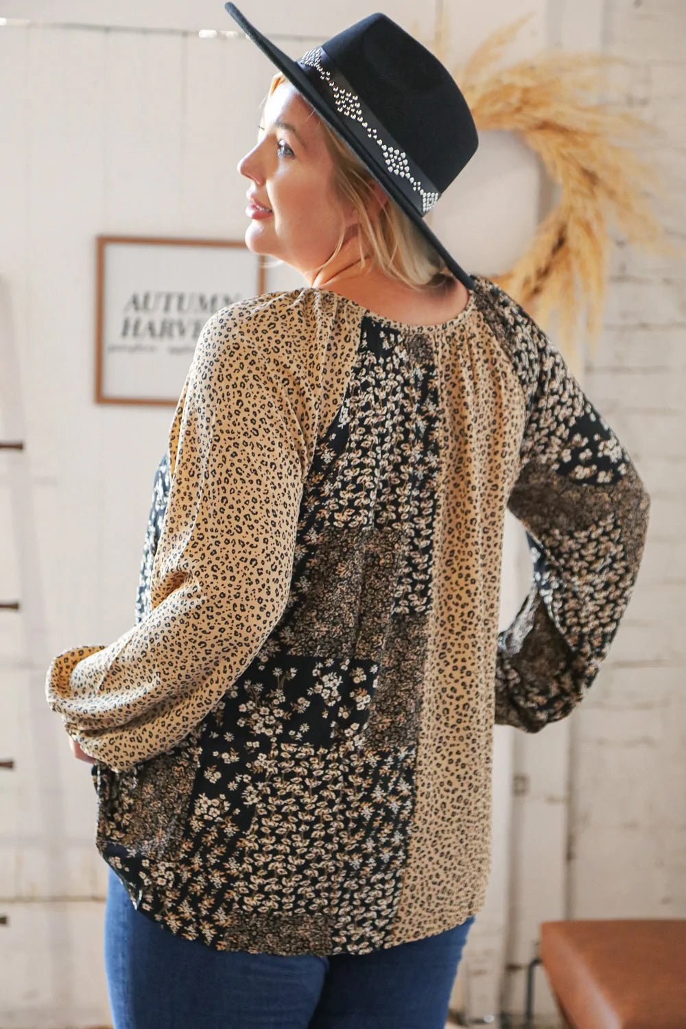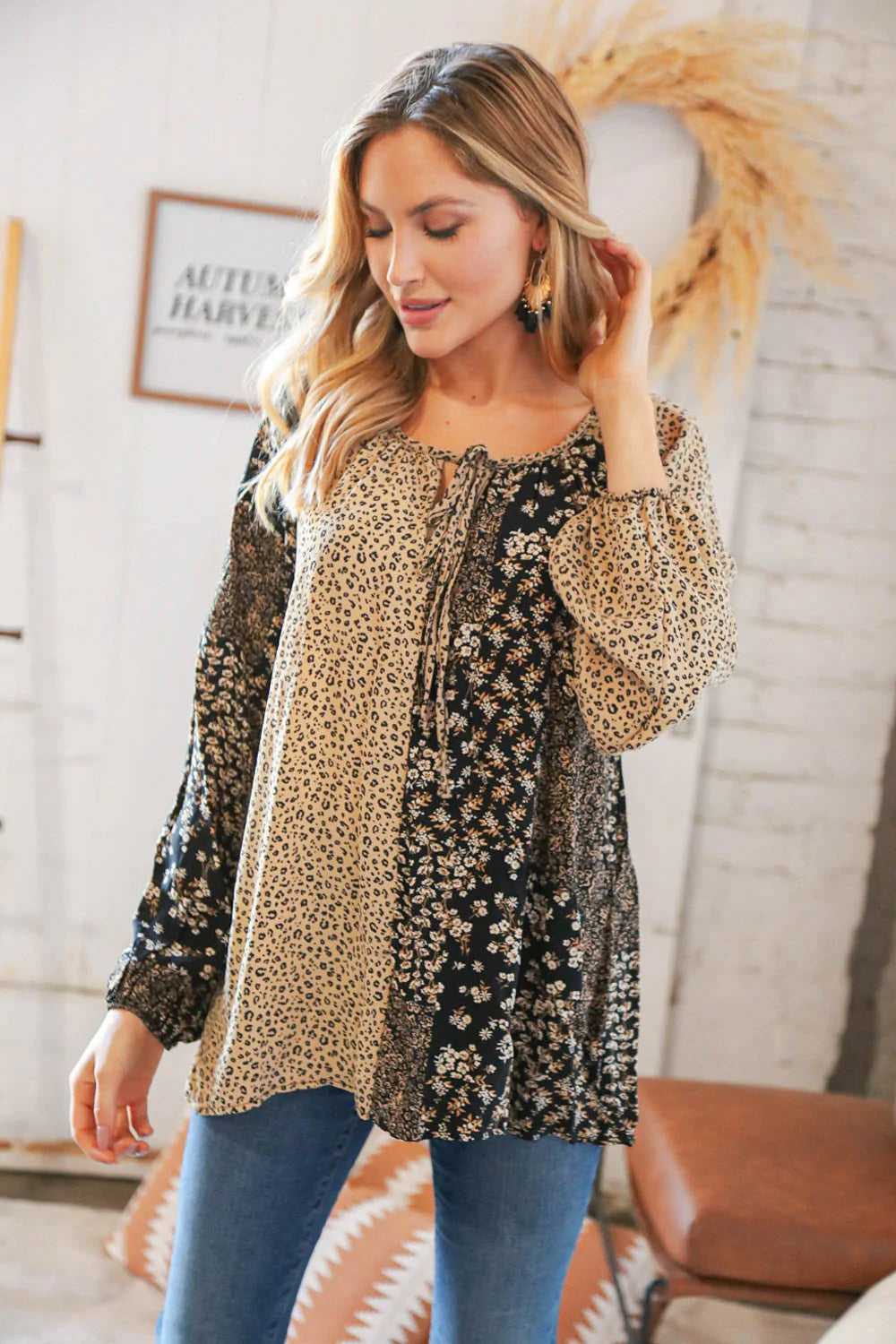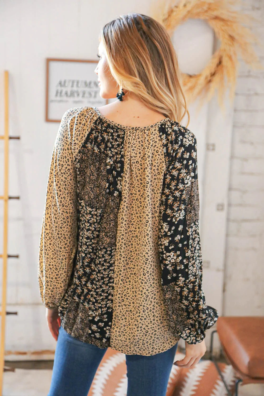 Black & Taupe Animal Print Ditzy Floral Color Block Keyhole Top