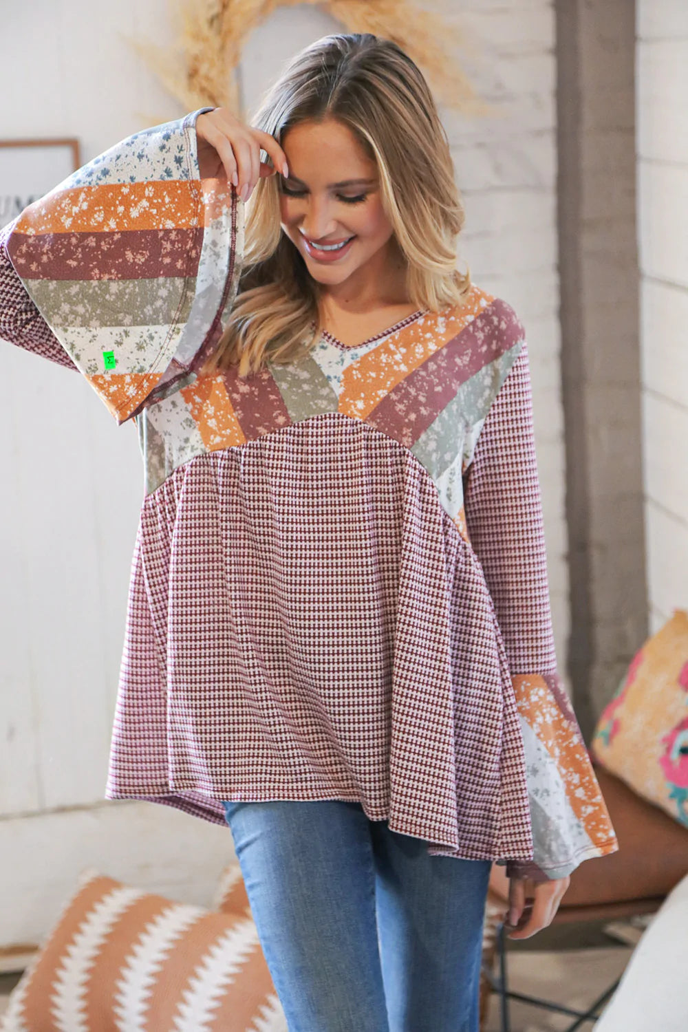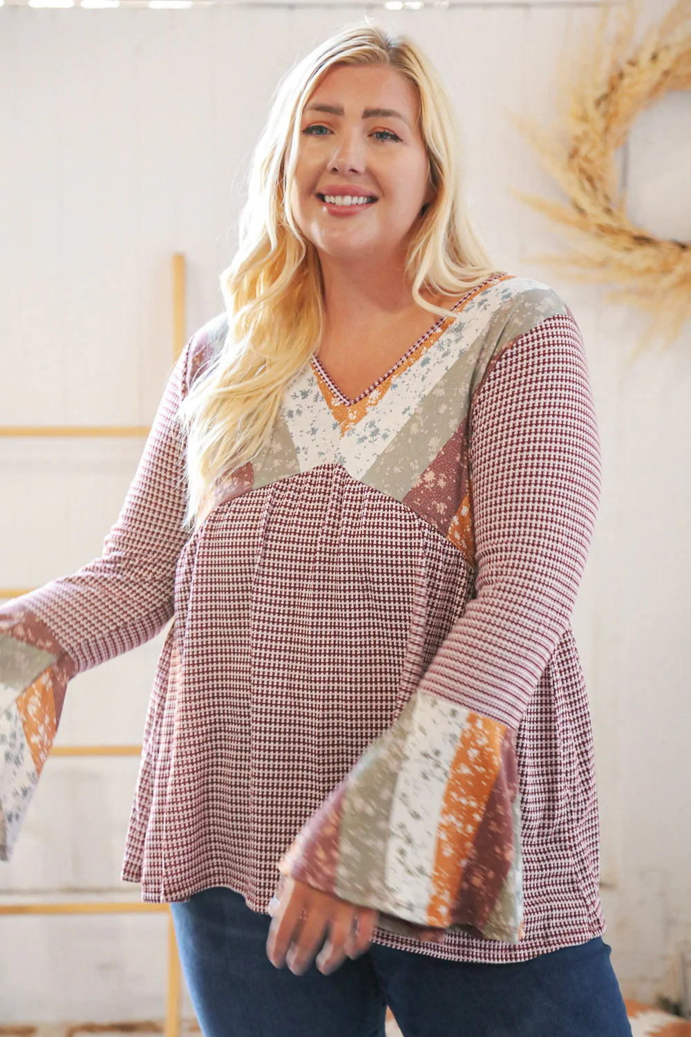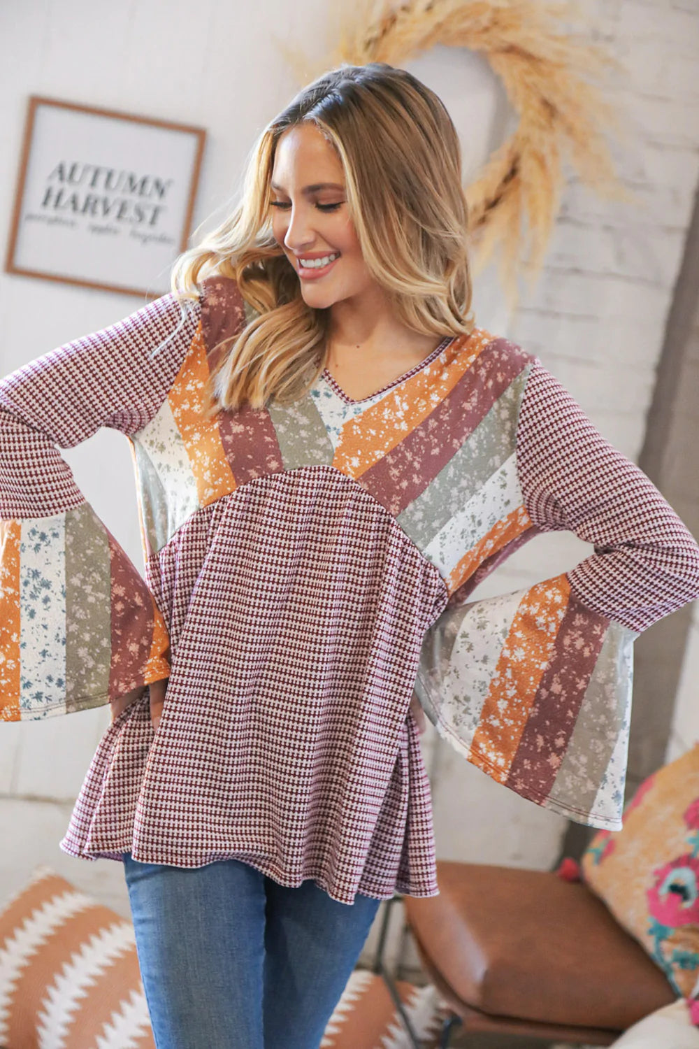 Burgundy Floral Stripe Two Tone Bell Sleeve Knit Top