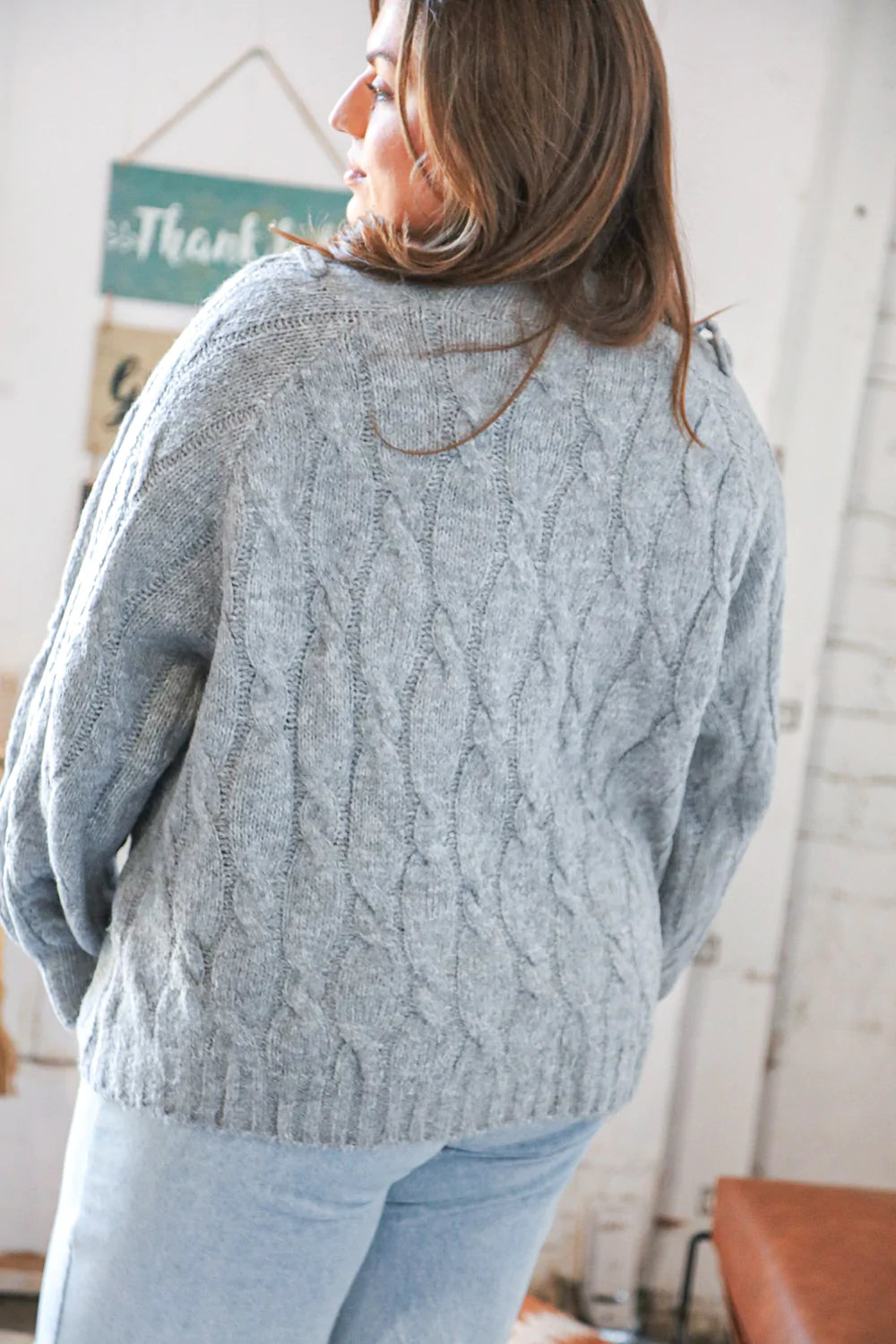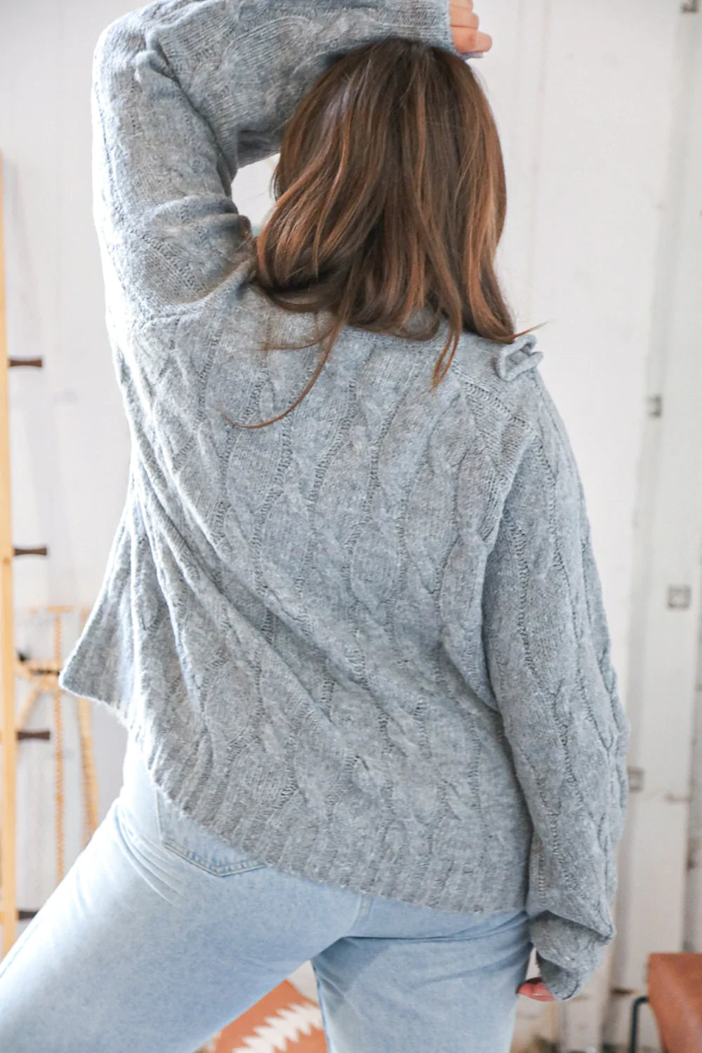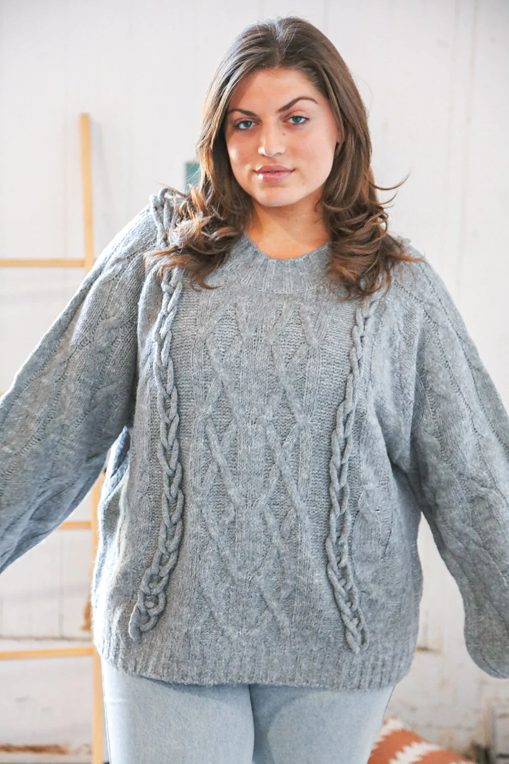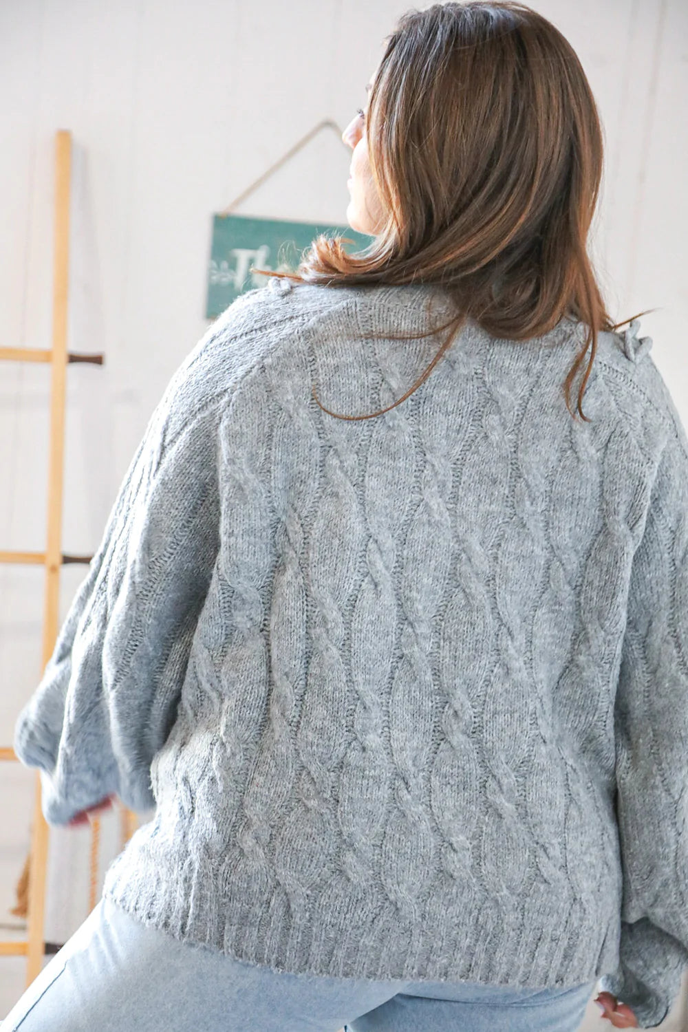 Grey Raglan Cable Knit Bubble Sleeve Sweater
