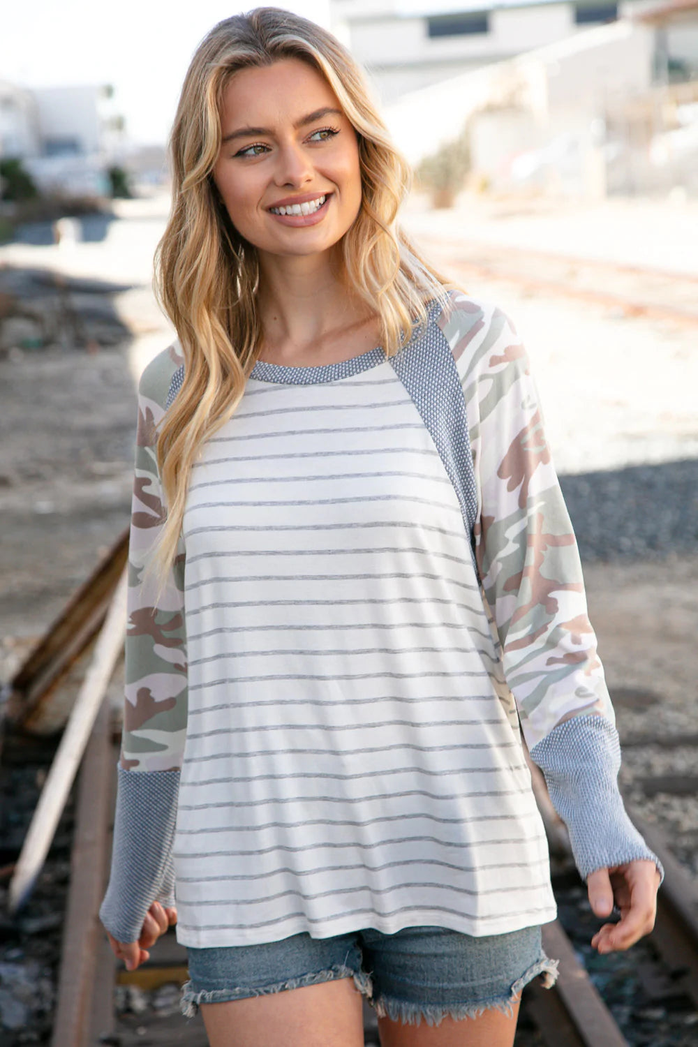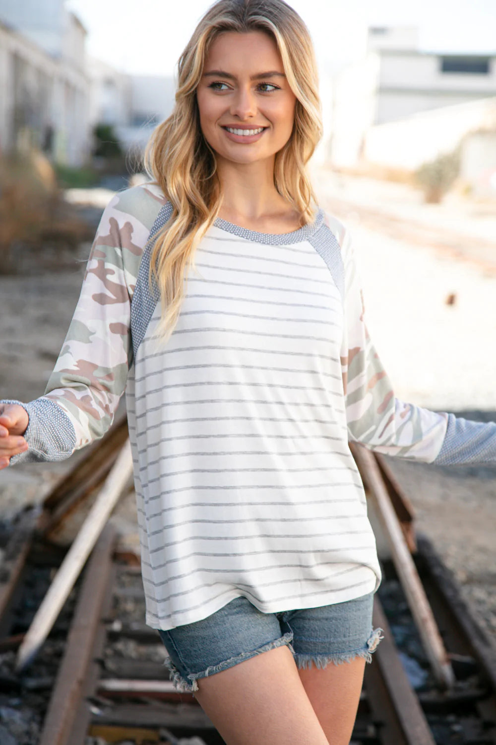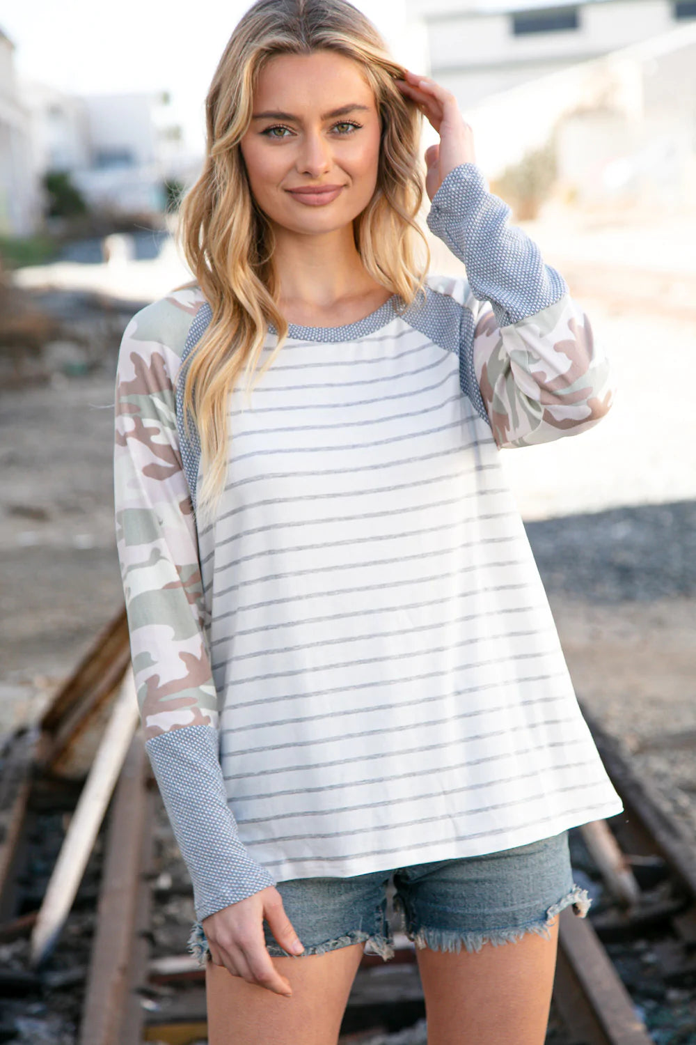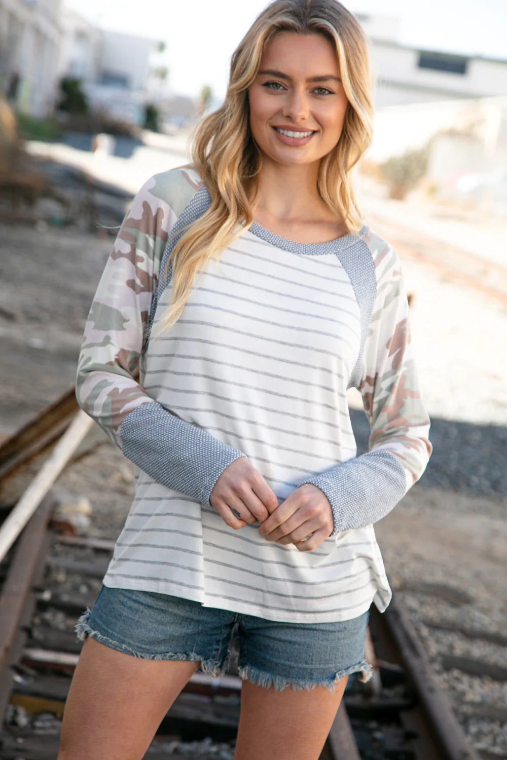 Donning grey two-tone textured knit, this stunning camo and stripe raglan top features long sleeves and a banded crew neck design. Slip this casual top over your fav denim.