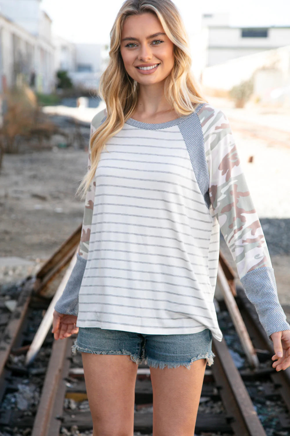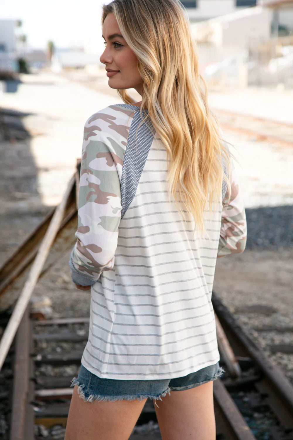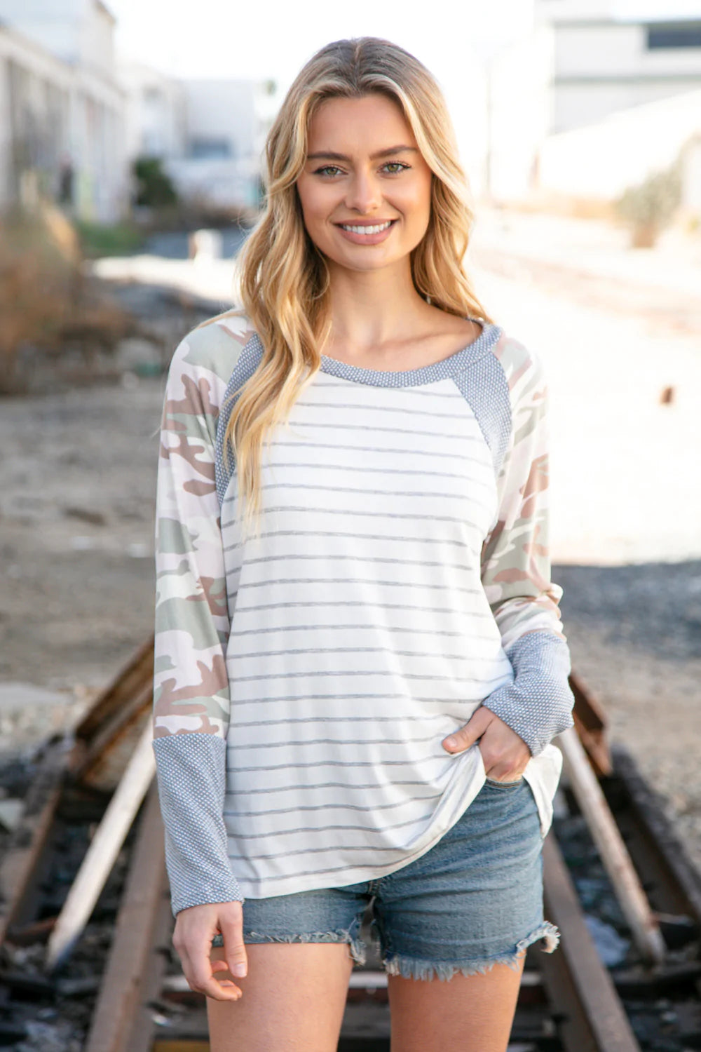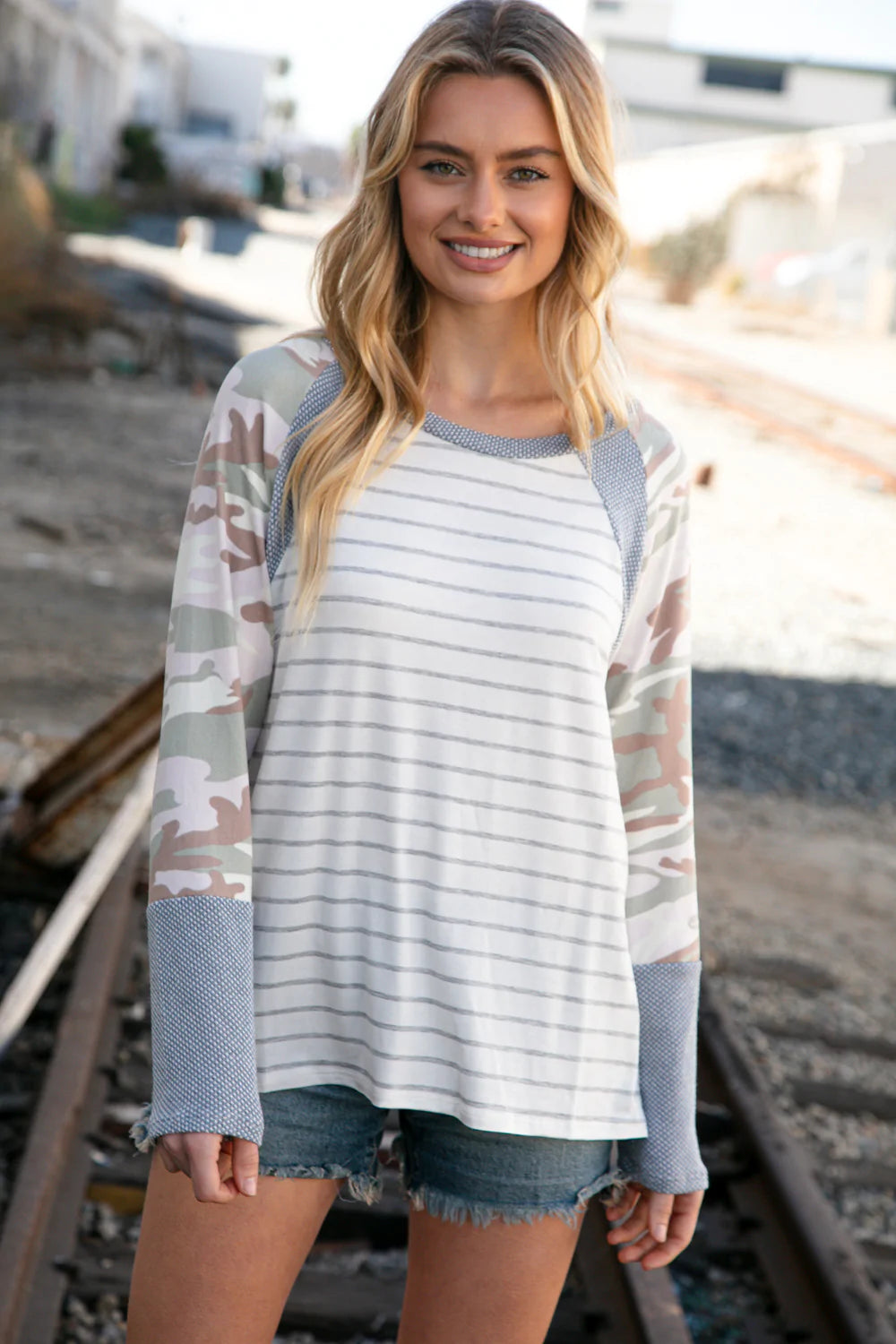 Donning grey two-tone textured knit, this stunning camo and stripe raglan top features long sleeves and a banded crew neck design. Slip this casual top over your fav denim.