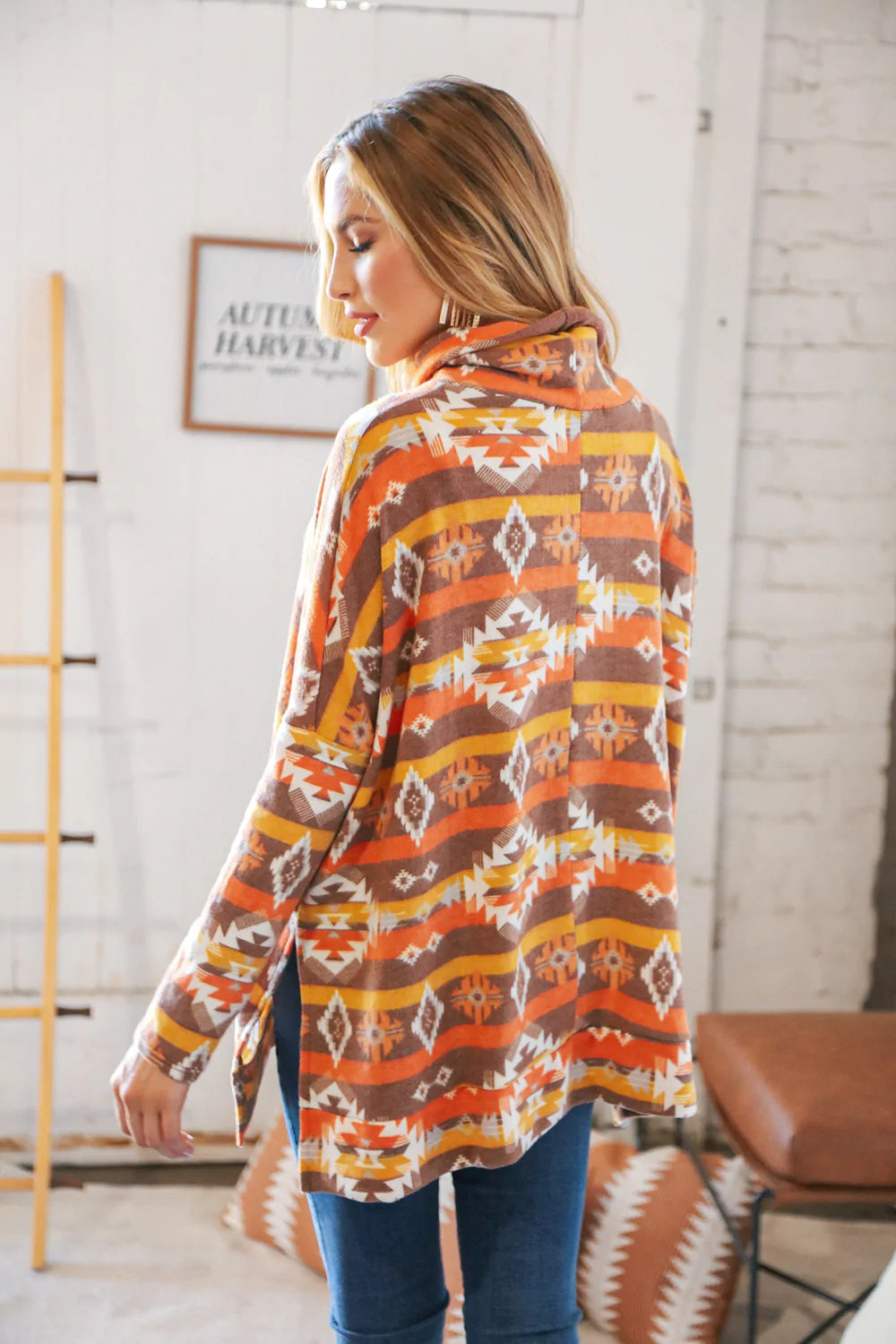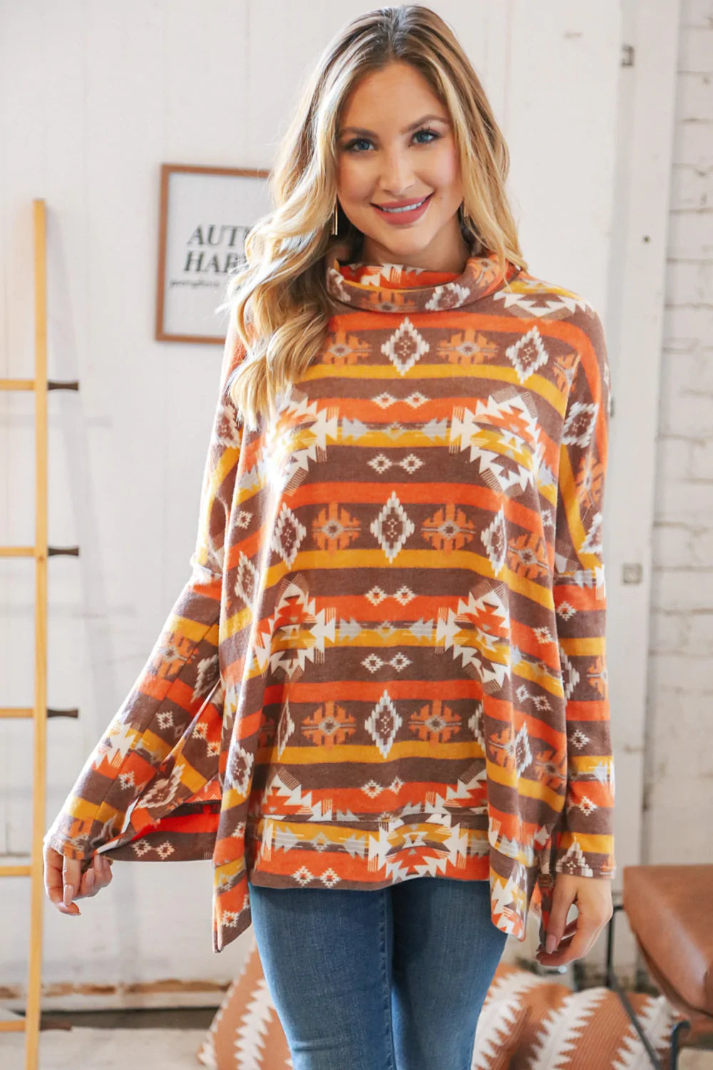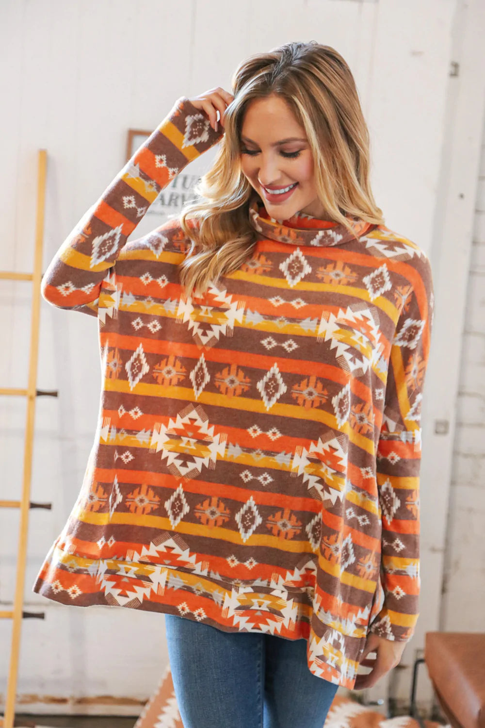 This long-sleeve Hacci Aztec print drop shoulder turtle neck feels oh-so-cozy and looks stylishly on-point. Side slits and a banded hemline complete this tunic-length top that pairs perfectly with your fav jeans or leggings!