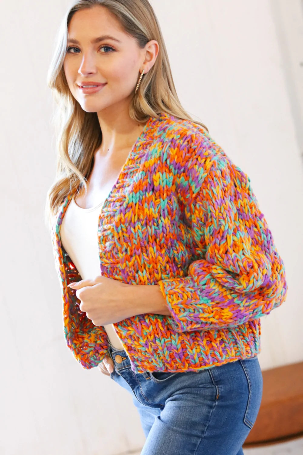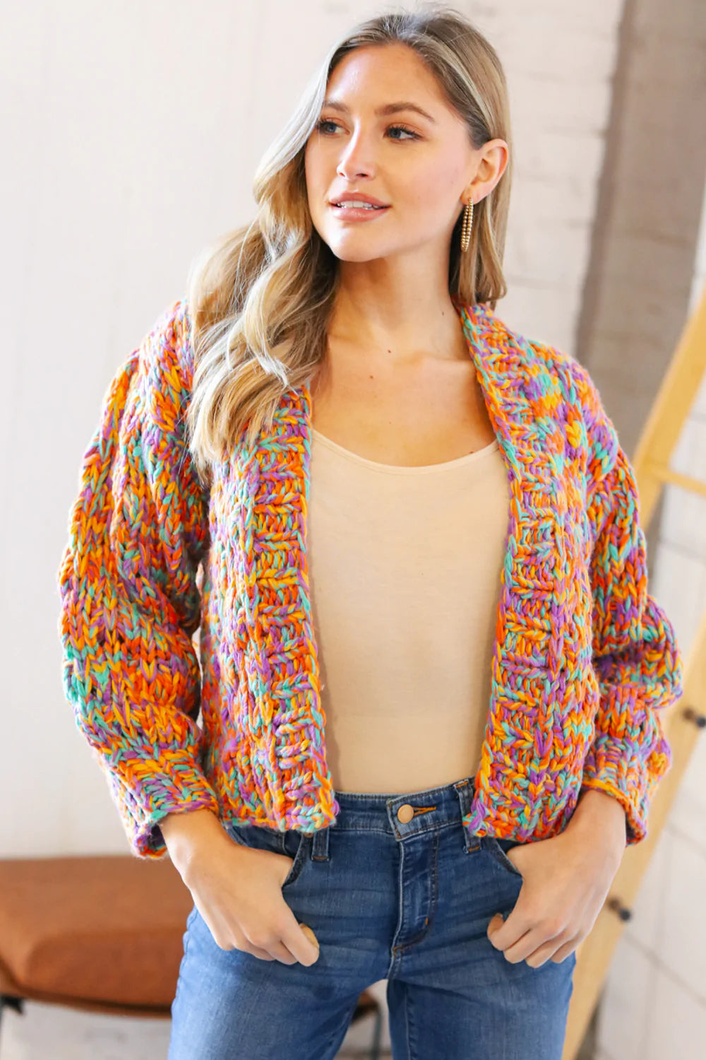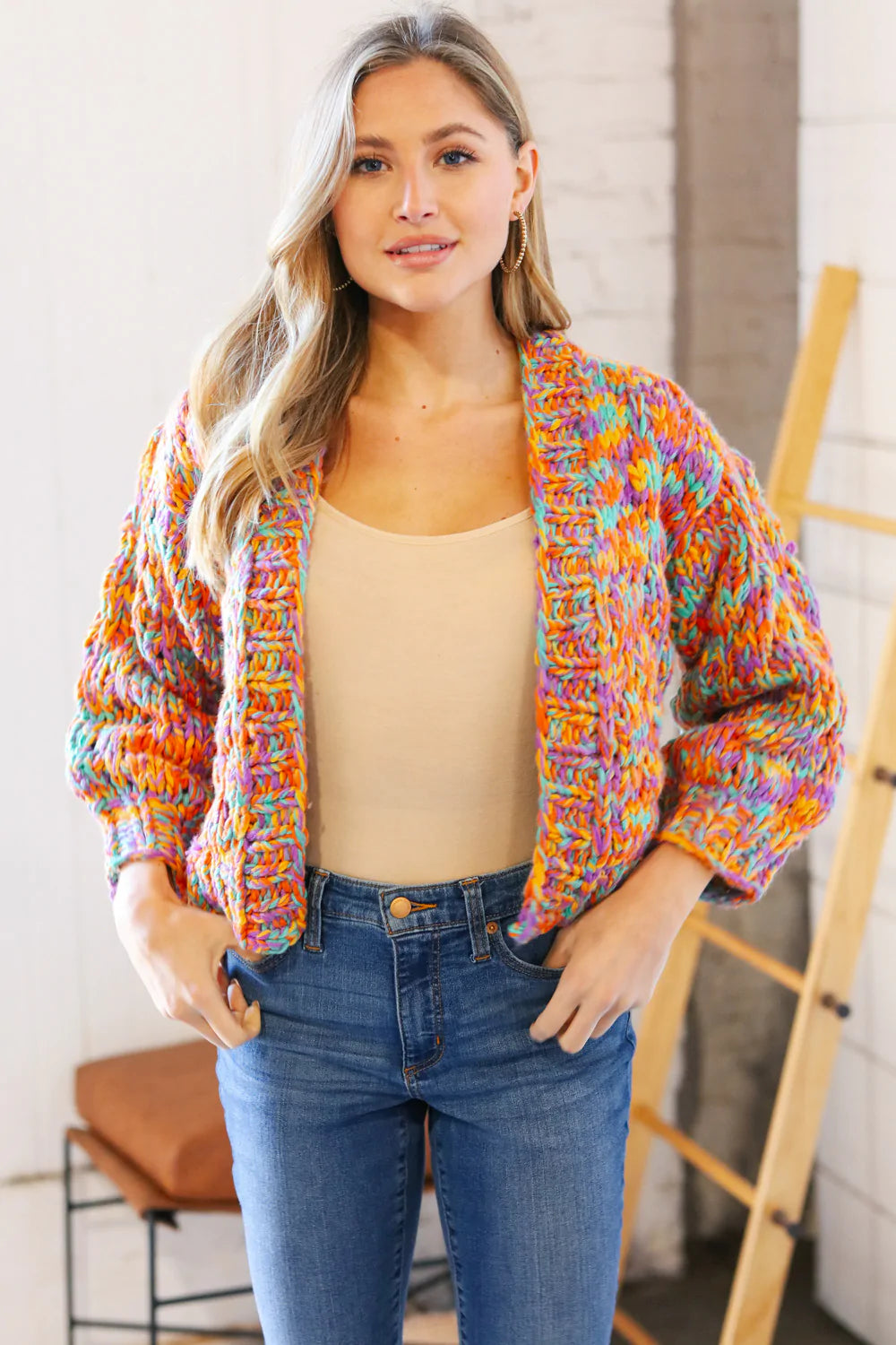 Give your winter closet a pop of color with this versatile multicolor chunky cropped open cardigan. With a cable knit design that offers plenty of warmth on cooler days, make a statement wherever you go with this stunning piece.