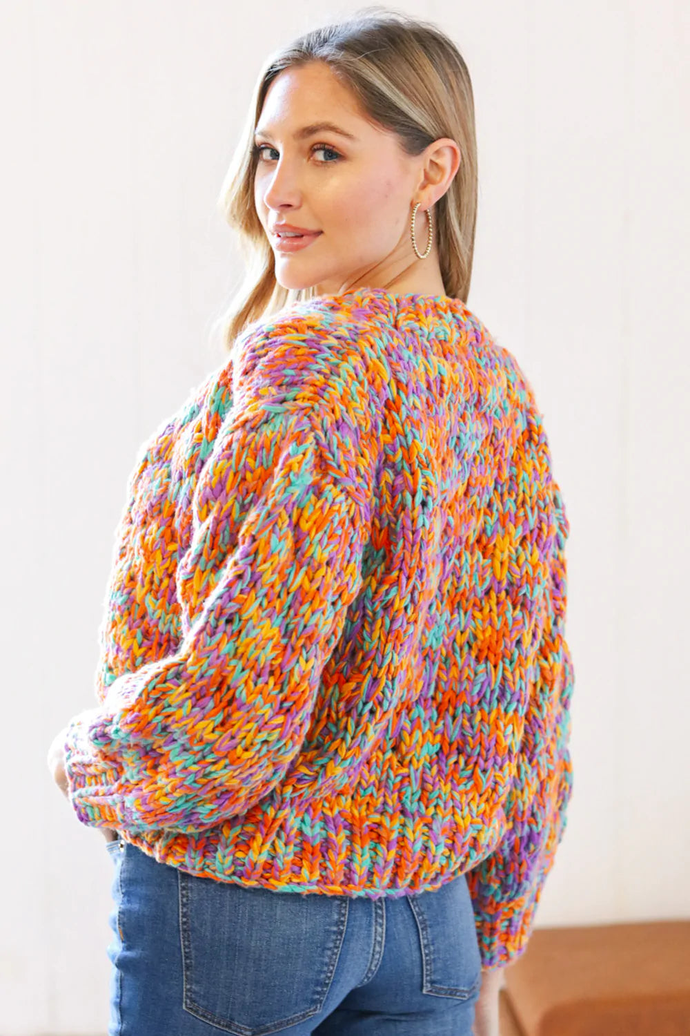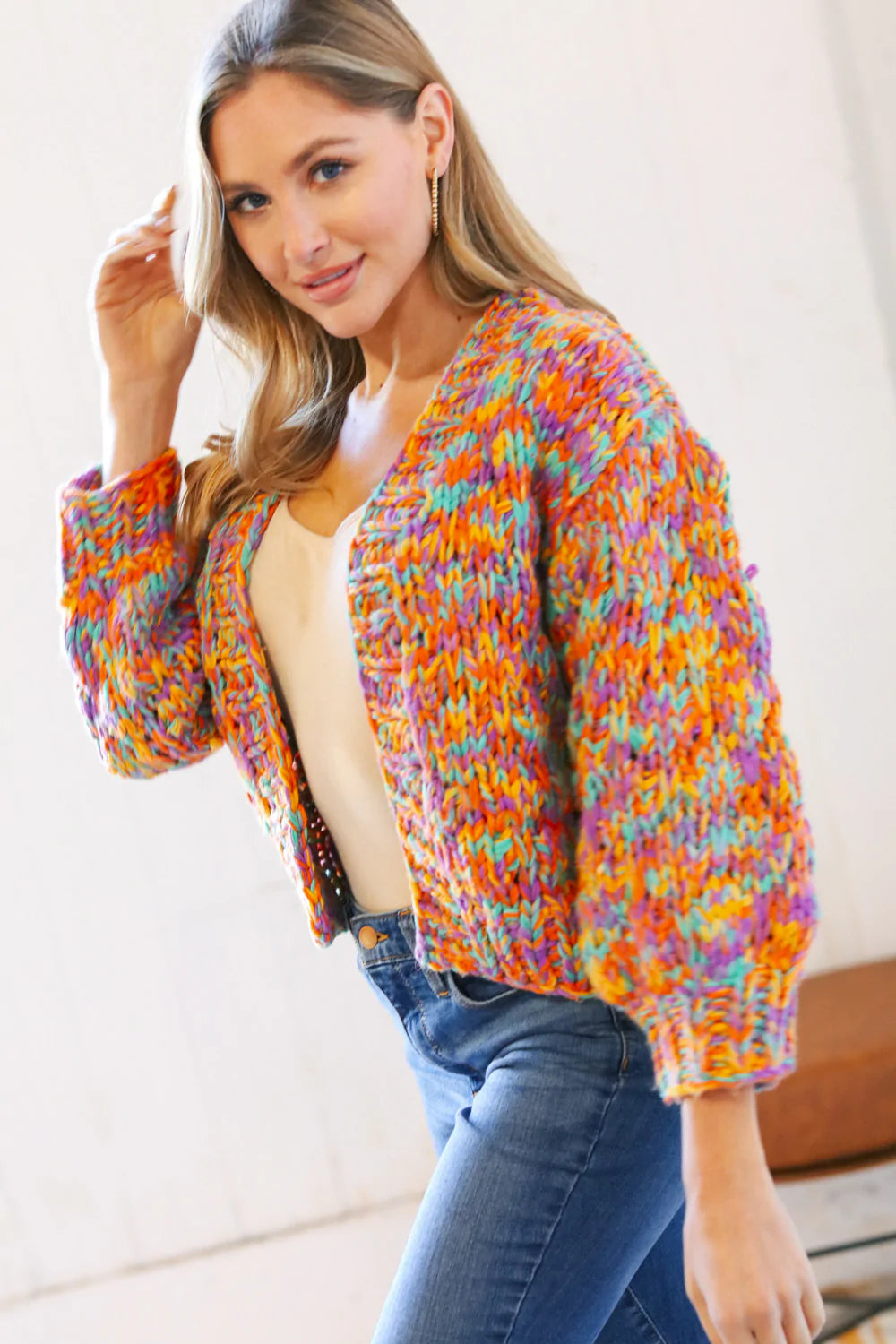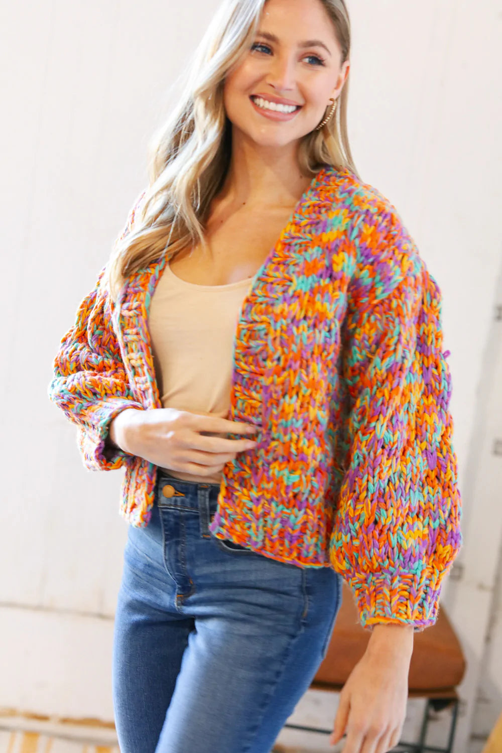 Give your winter closet a pop of color with this versatile multicolor chunky cropped open cardigan. With a cable knit design that offers plenty of warmth on cooler days, make a statement wherever you go with this stunning piece.