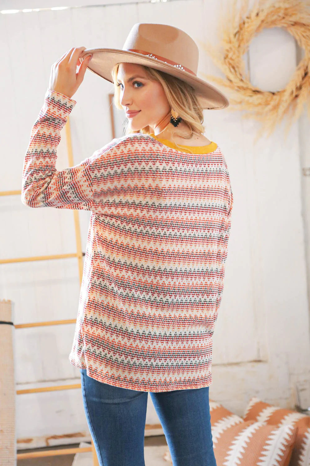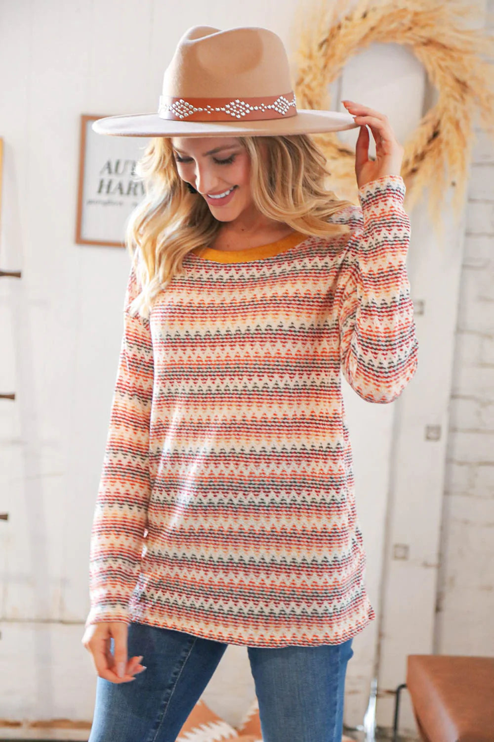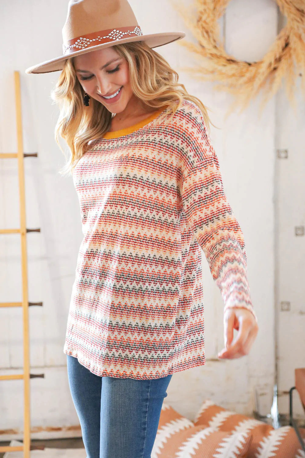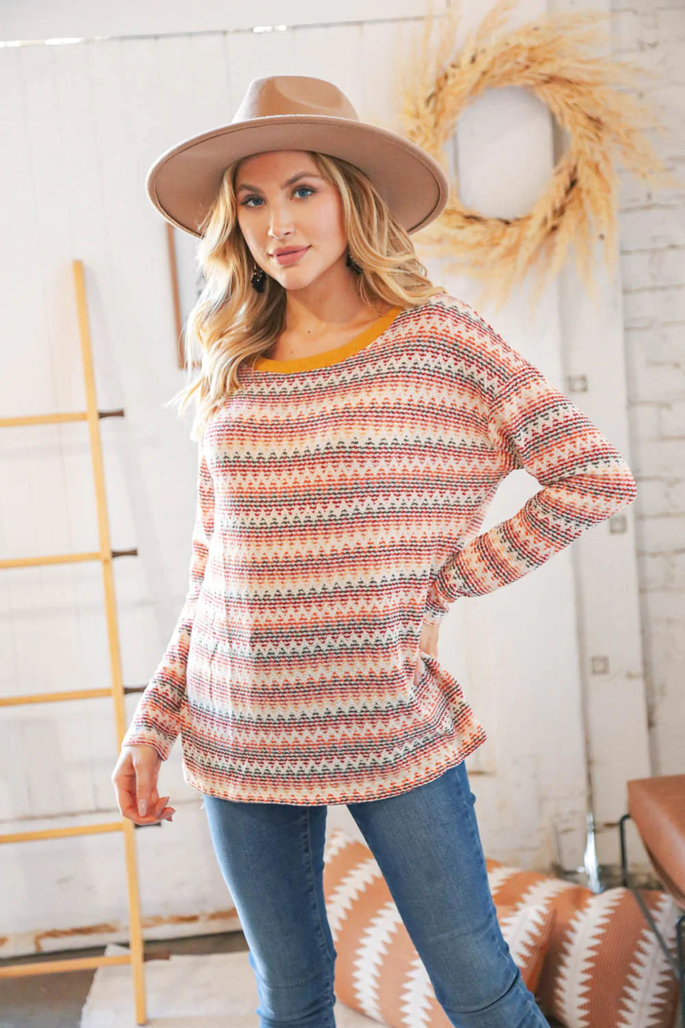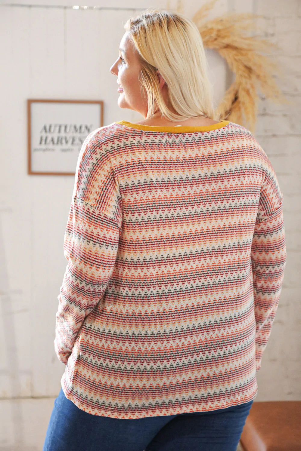 Spice up your fall ensemble with this trendy zig zag light-weight sweater top featuring loose textured knit and a mustard banded round neck.