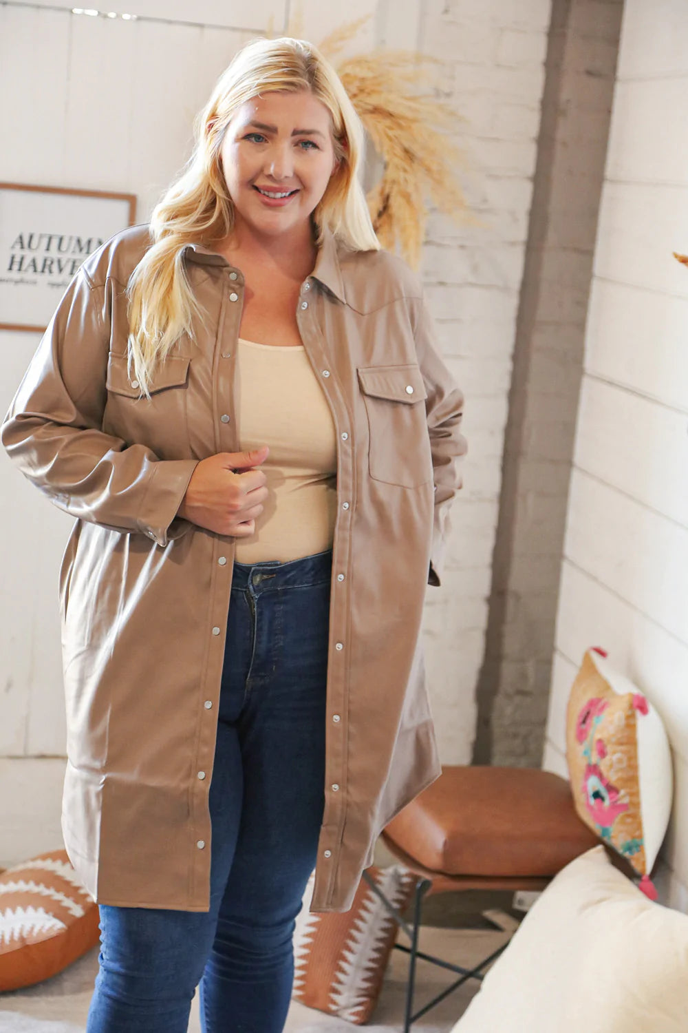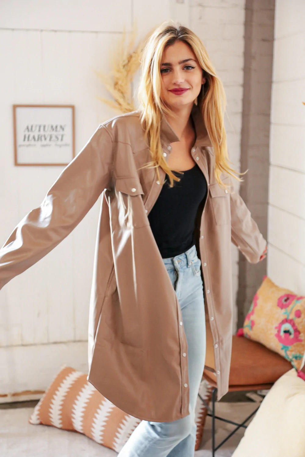 Taupe Faux Leather Sanp Button Down Shirt Jacket