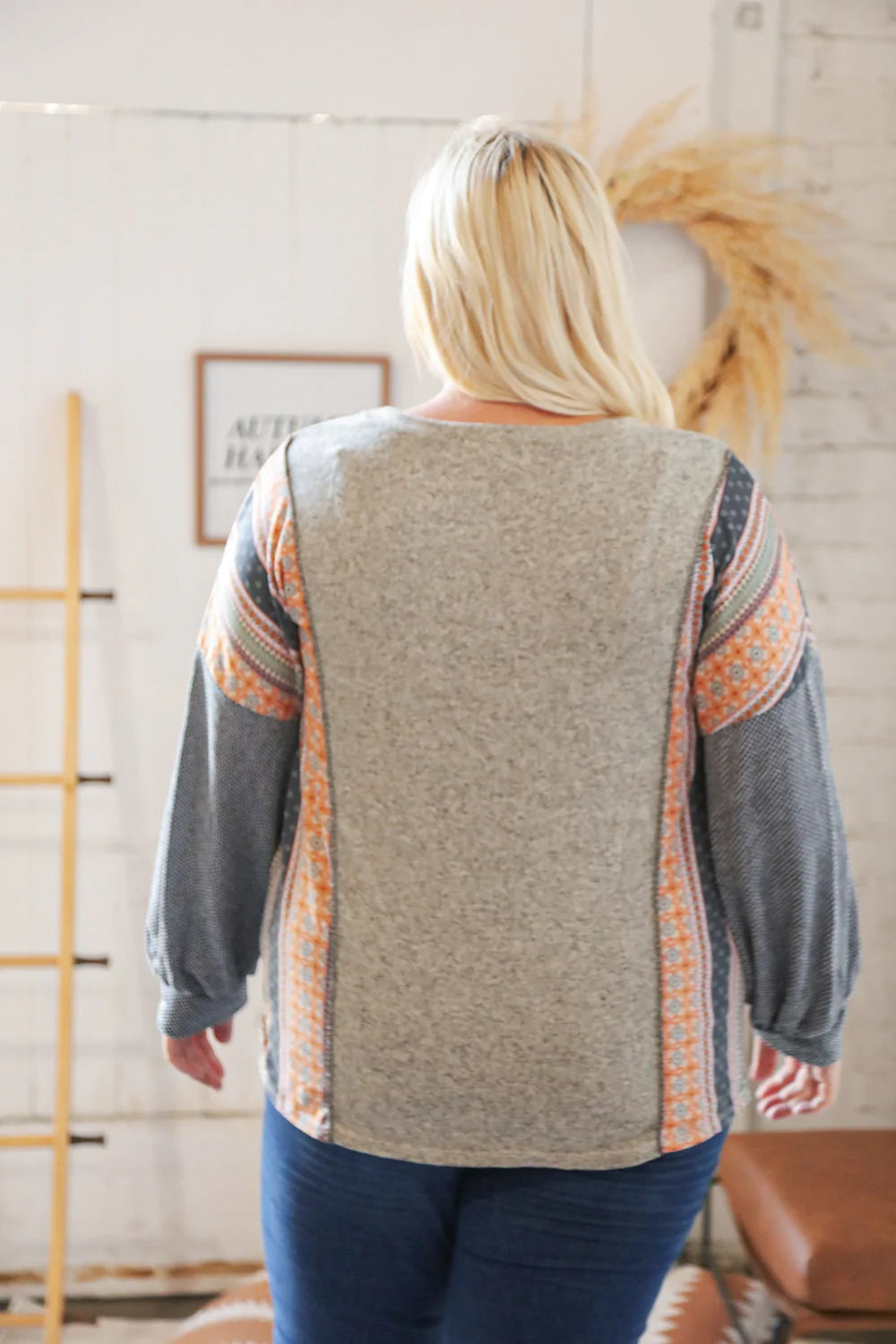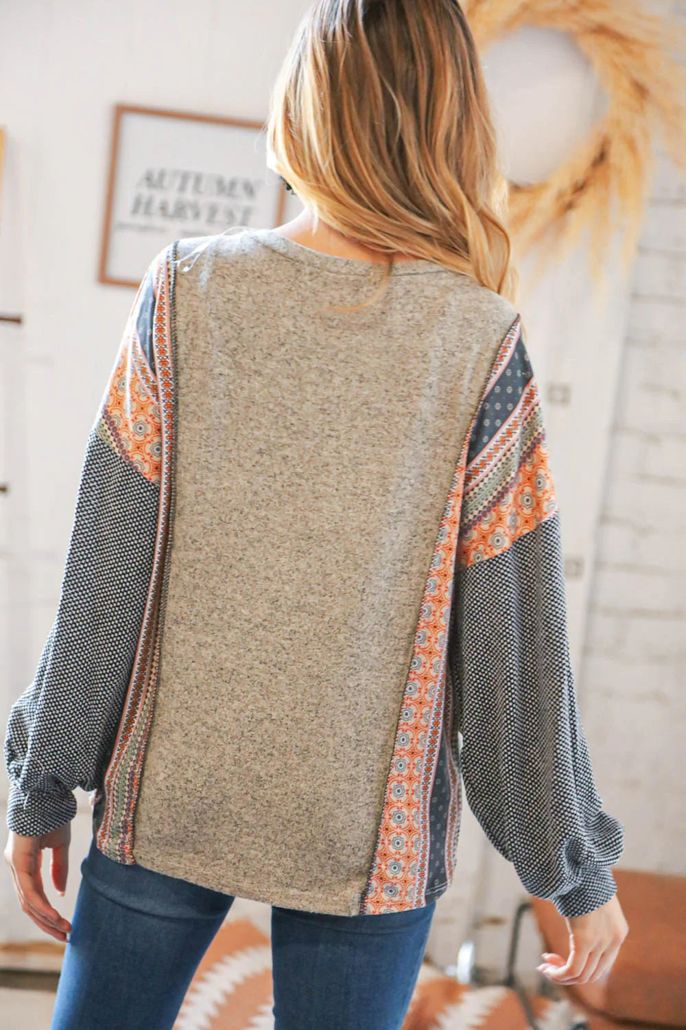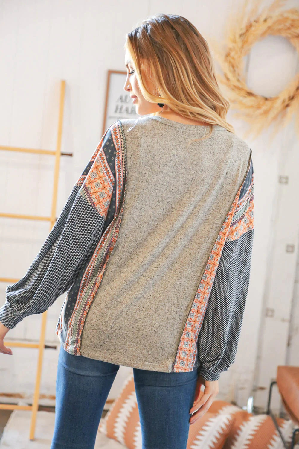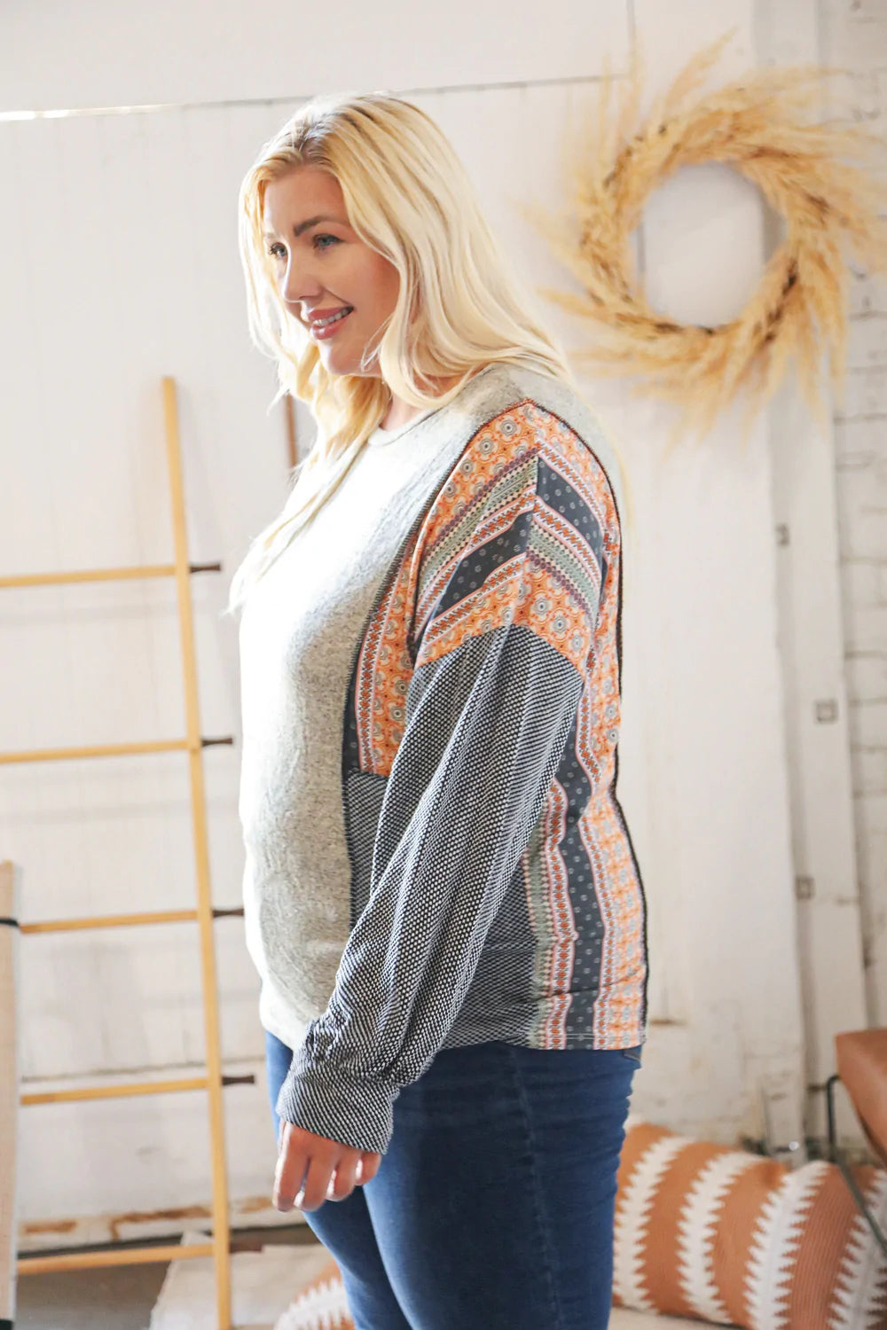 Two Tone Hacci Boho Outseam Jacquard Pullover