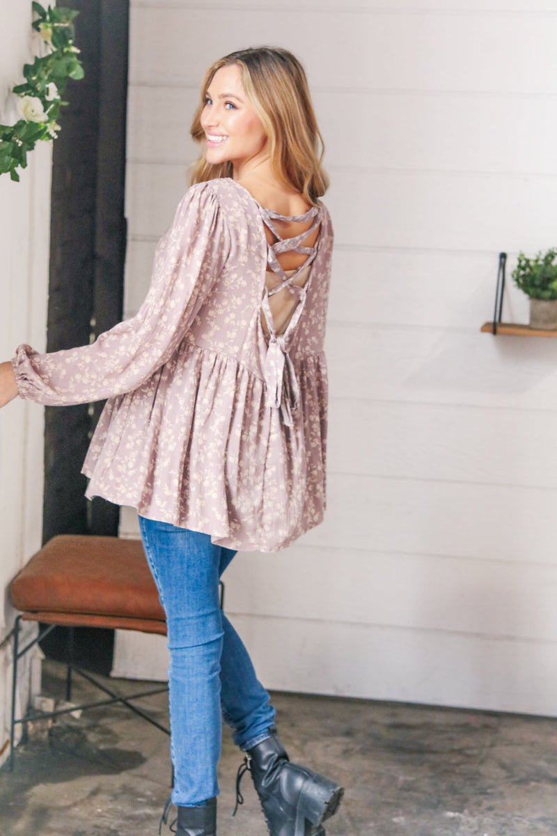 Mauve Crinkle Floral Lace-Up Woven Bubble Sleeve Top