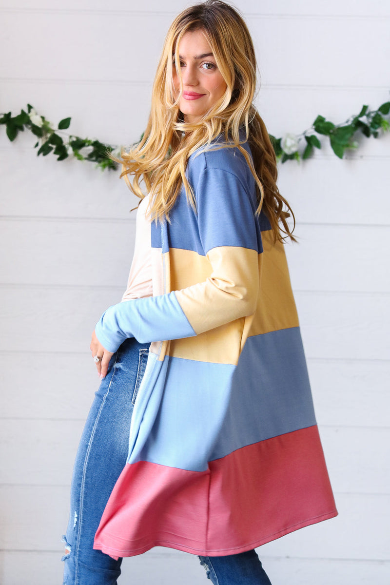 Denim Wide Stripe Terry Color Block Open Cardigan
