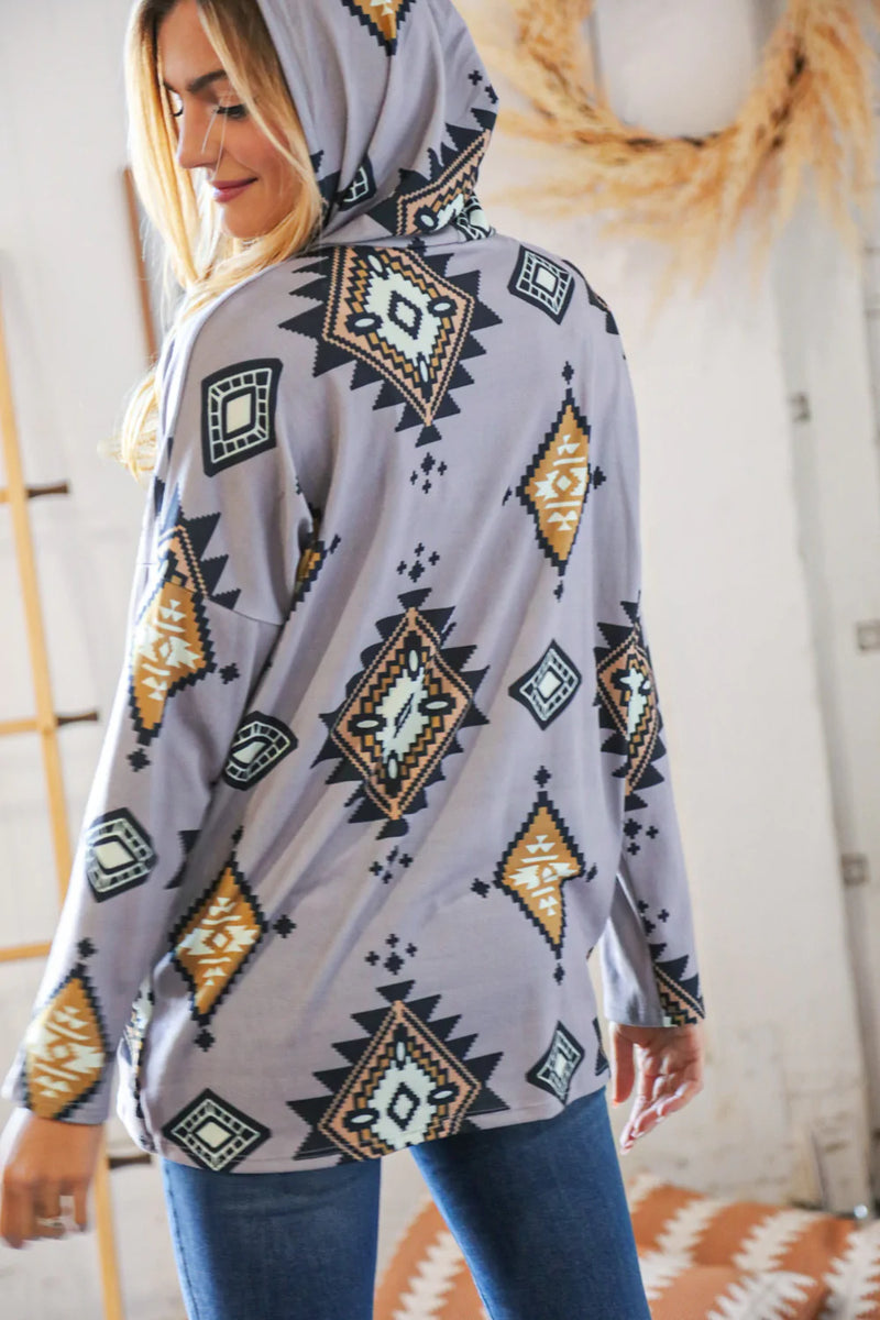 Grey Blue Tribal Hacci Drawstring Hoodie
