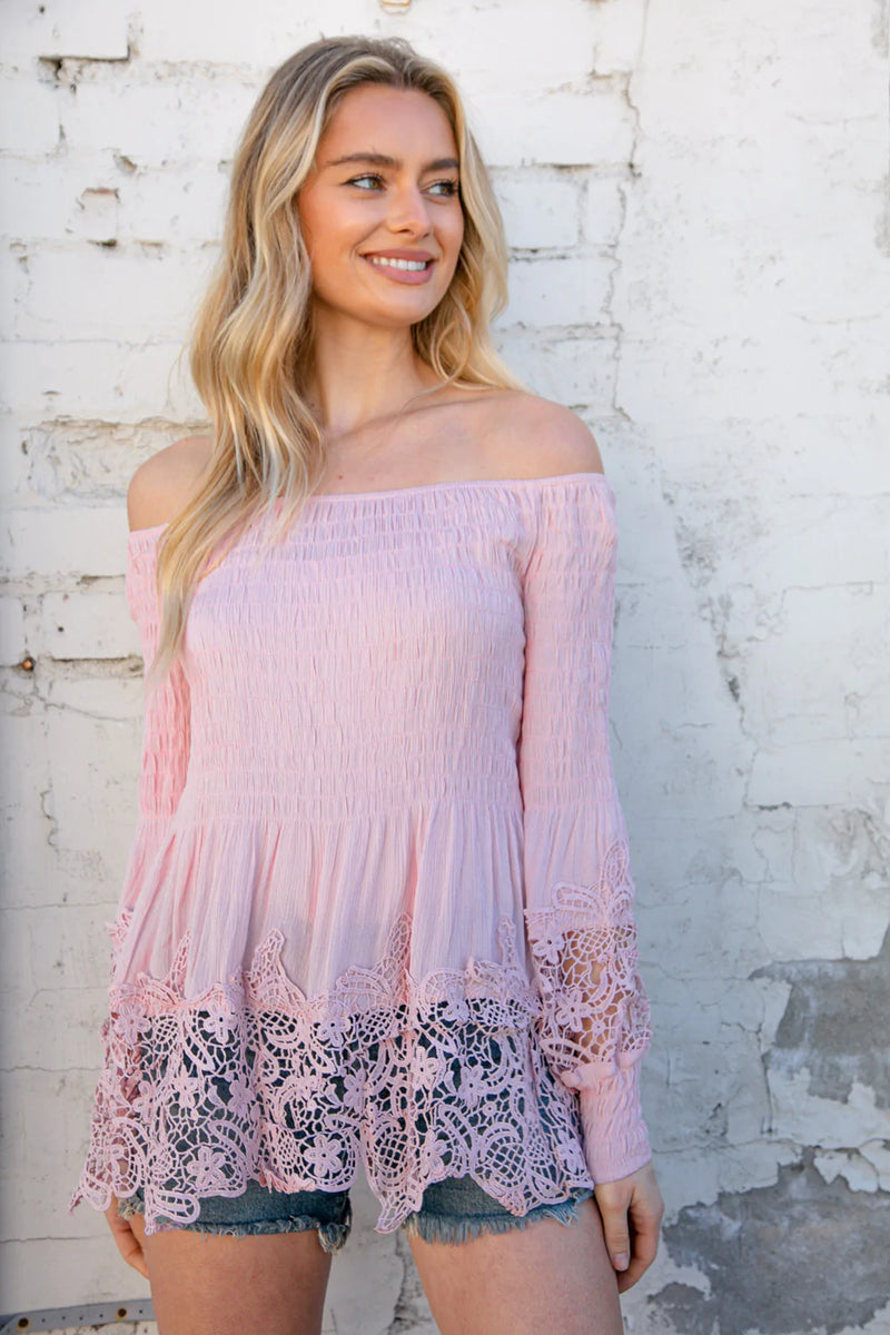 Blush Off-Shoulder Smocked Bubble Sleeve Crochet Top
