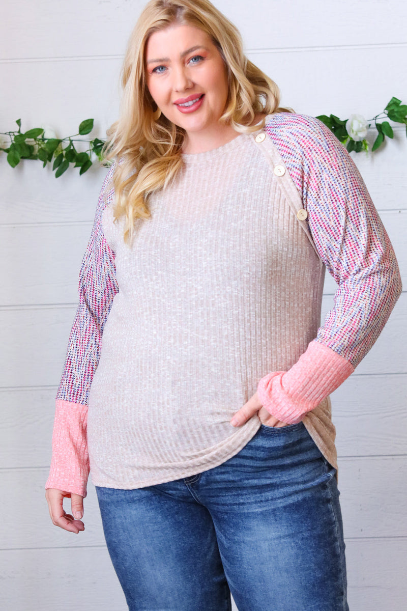 Taupe Two Tone Rib Chevron Button Raglan Top