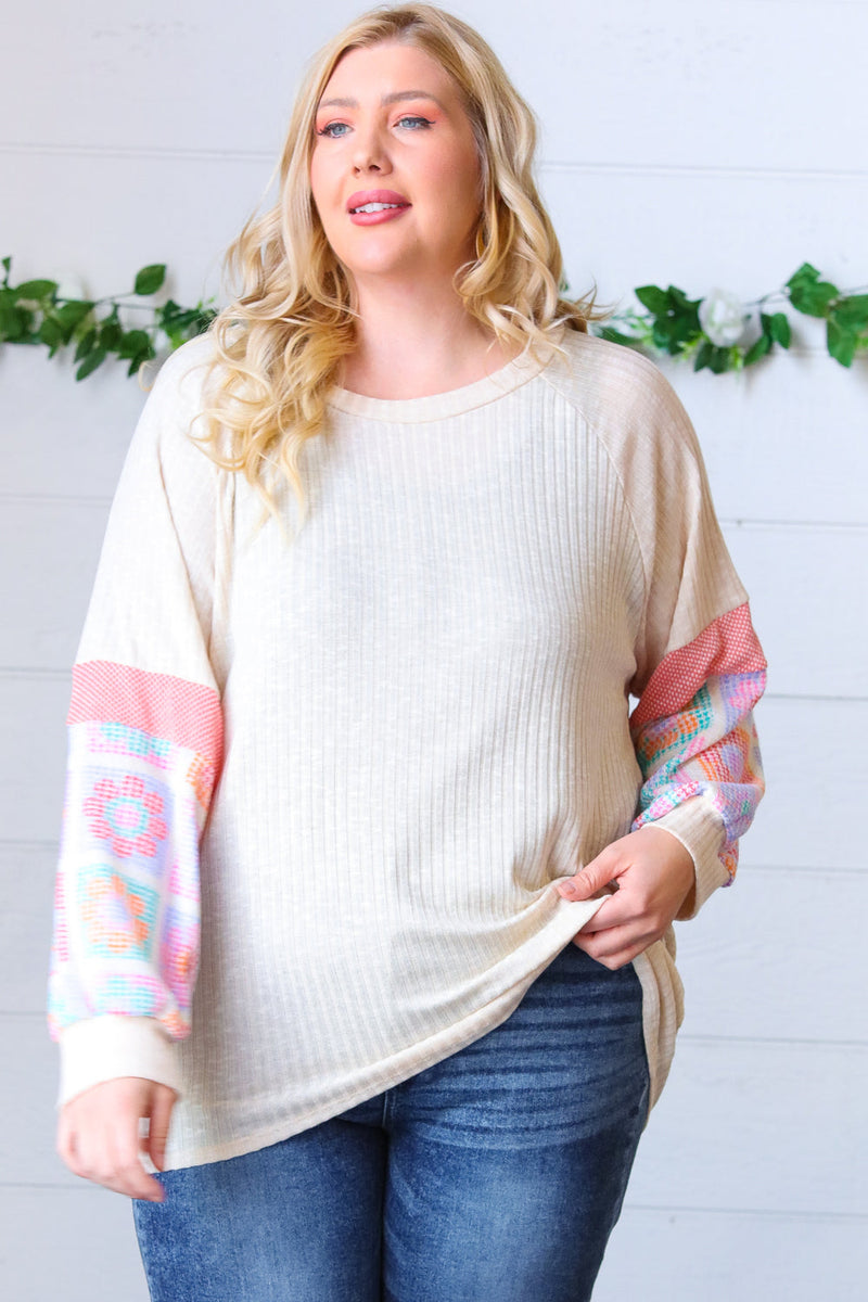 Oatmeal Two-Tone Floral Crochet Print Raglan Bubble Sleeve Top