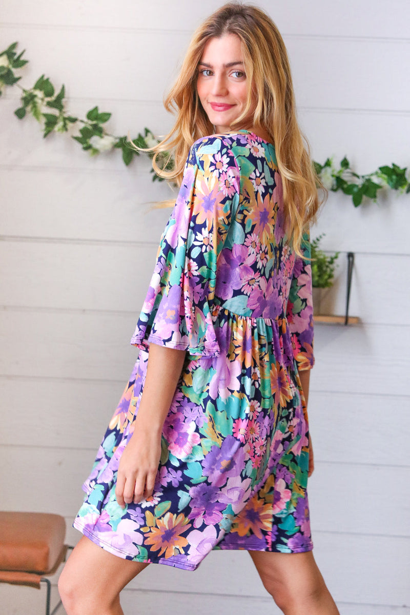 Mint Floral Babydoll Bell Sleeve Pocketed Dress