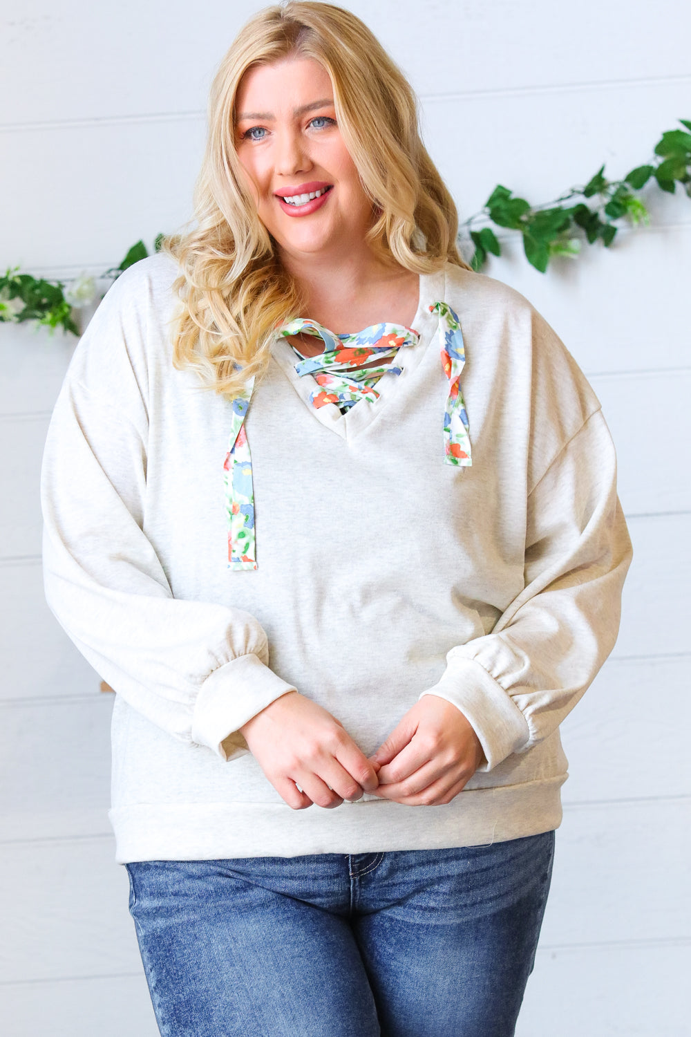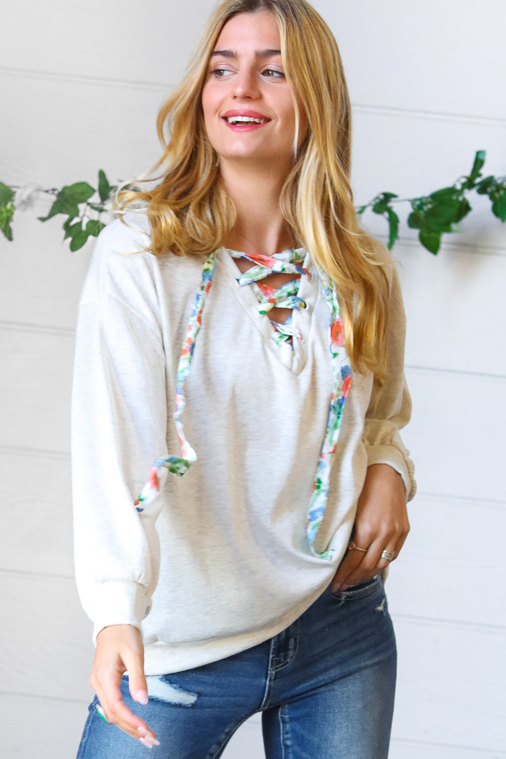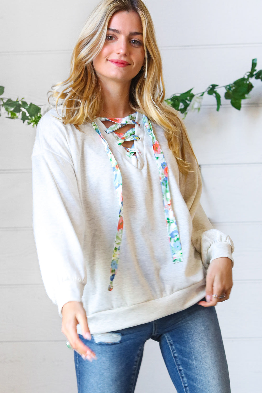 Take your love of cute, cozy knitwear into the warmer months with this cotton terry pullover featuring a floral print lace up design. Banded drop shoulder long sleeves and out seam overlock stitching on the back complete this adorable style.