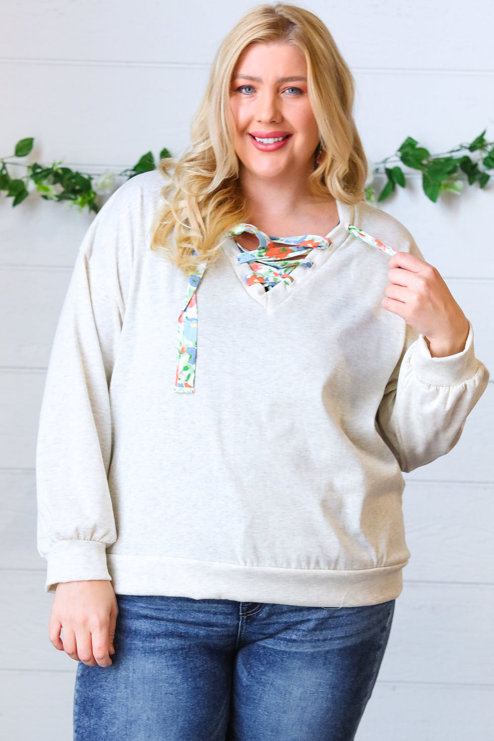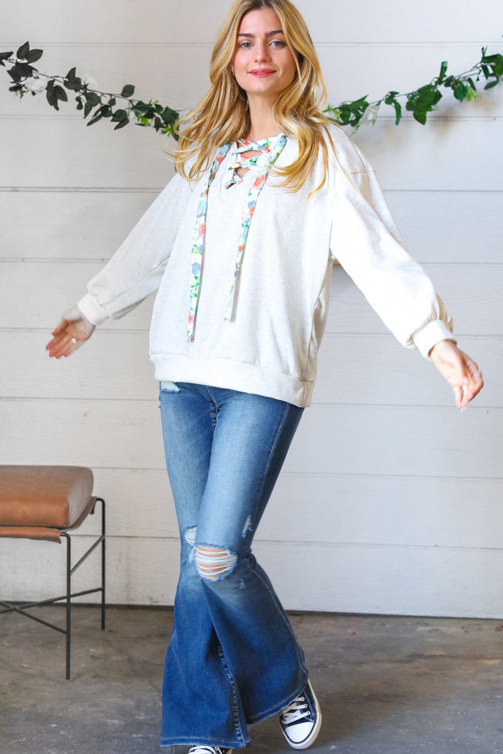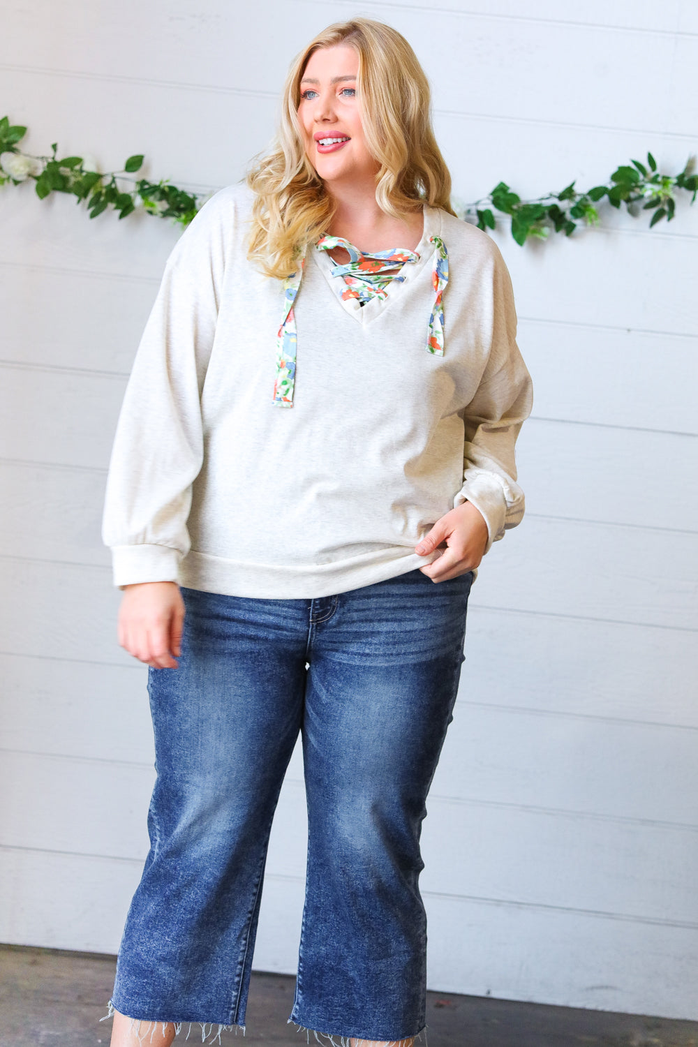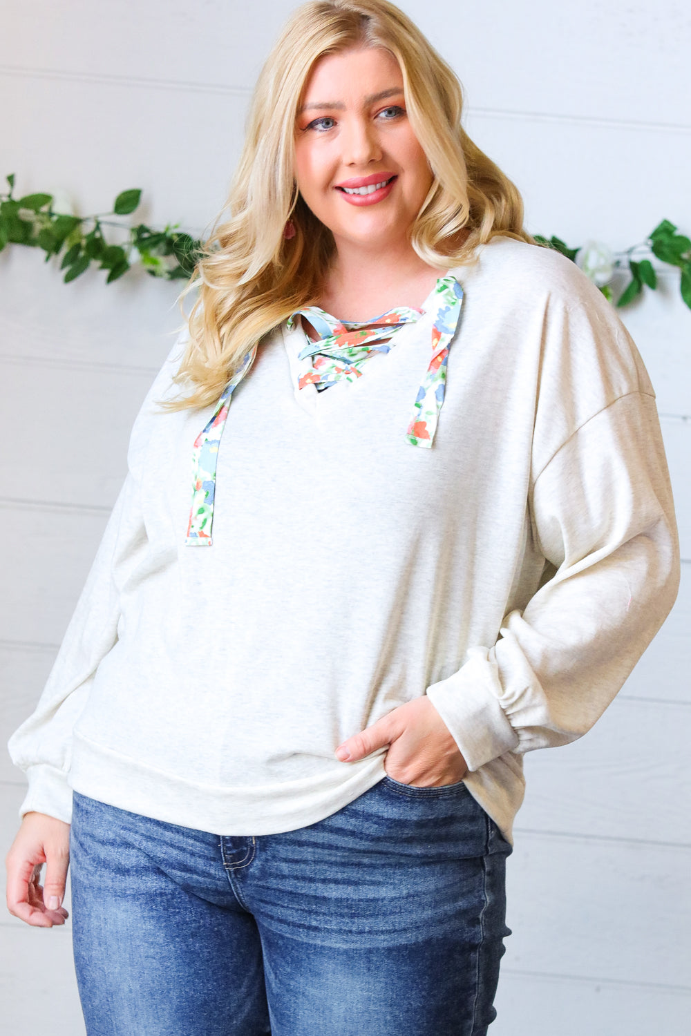 Take your love of cute, cozy knitwear into the warmer months with this cotton terry pullover featuring a floral print lace up design. Banded drop shoulder long sleeves and out seam overlock stitching on the back complete this adorable style.