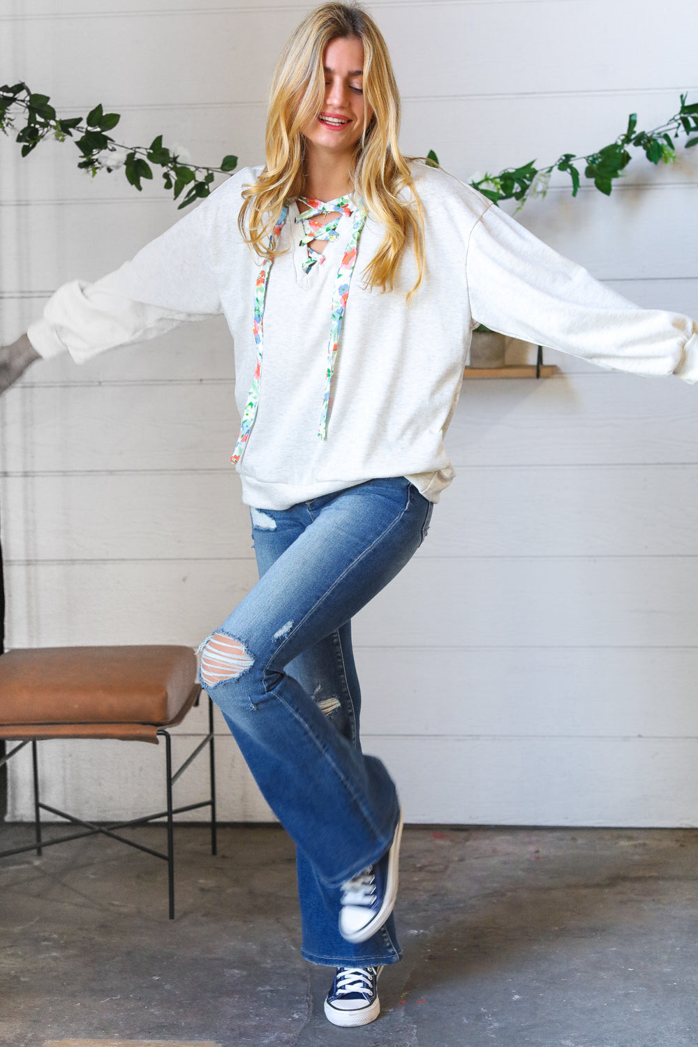 Cream Cotton Terry Floral Print Lace Up Pullover