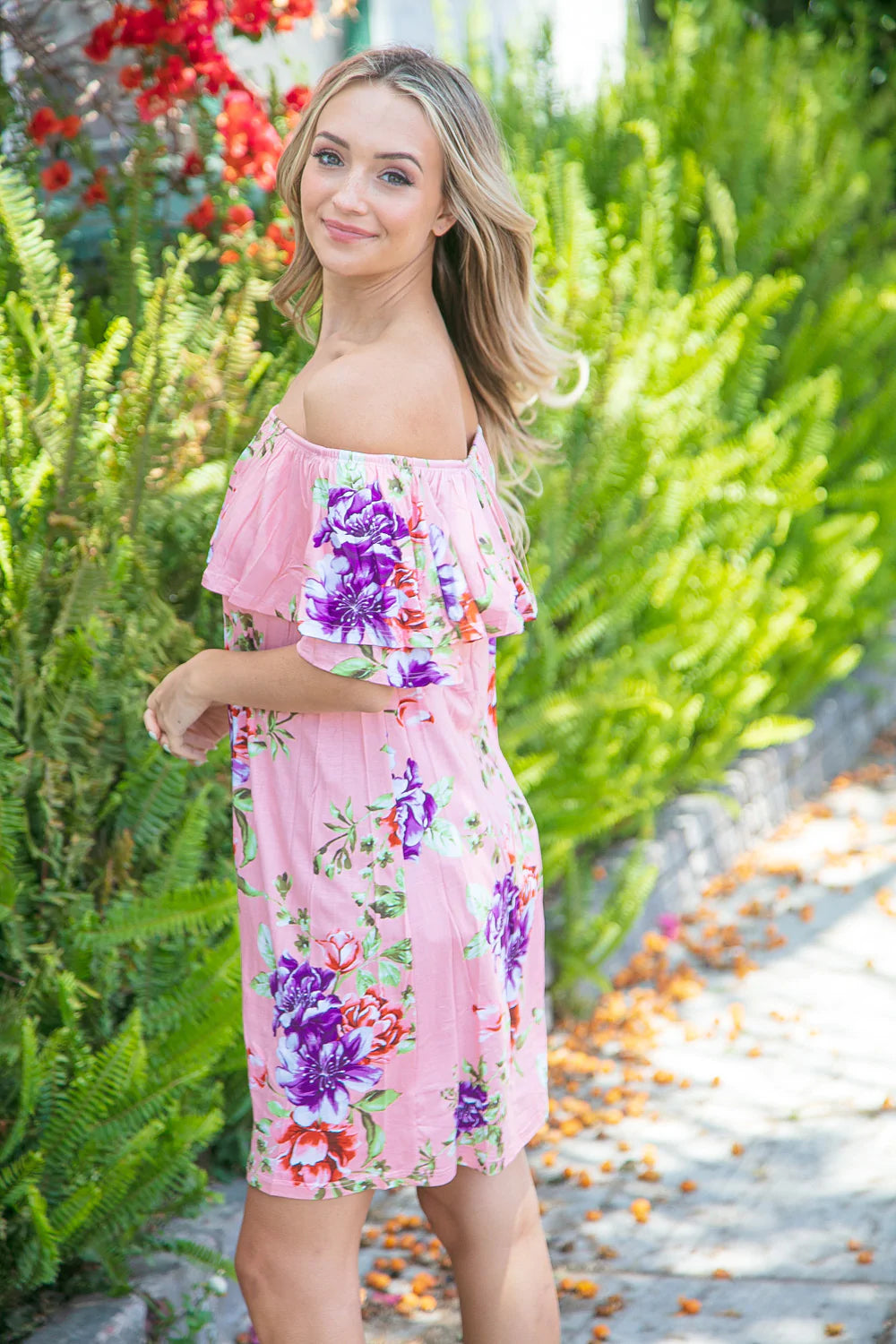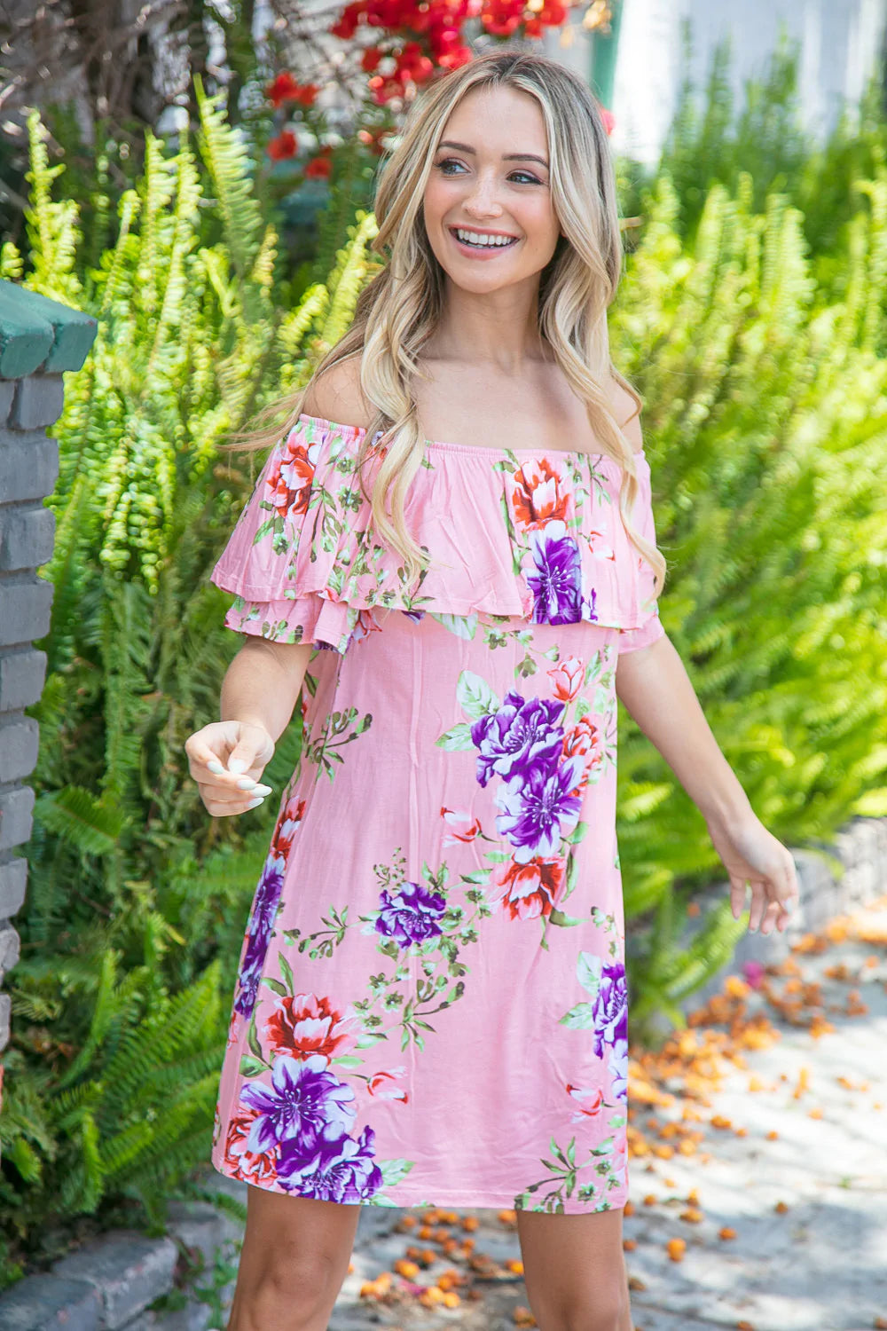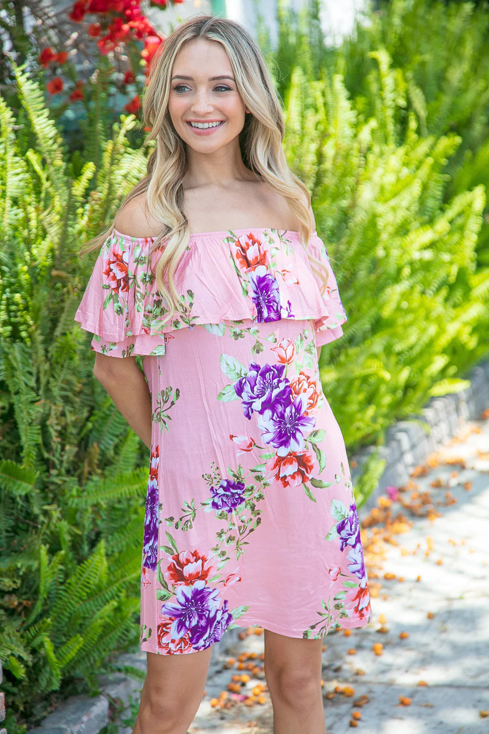 Off shoulder floral round neck dress designed with a swing silhouette. Accessorize wtth lace-up booties, necklace and a wide brim hat for a striking look.