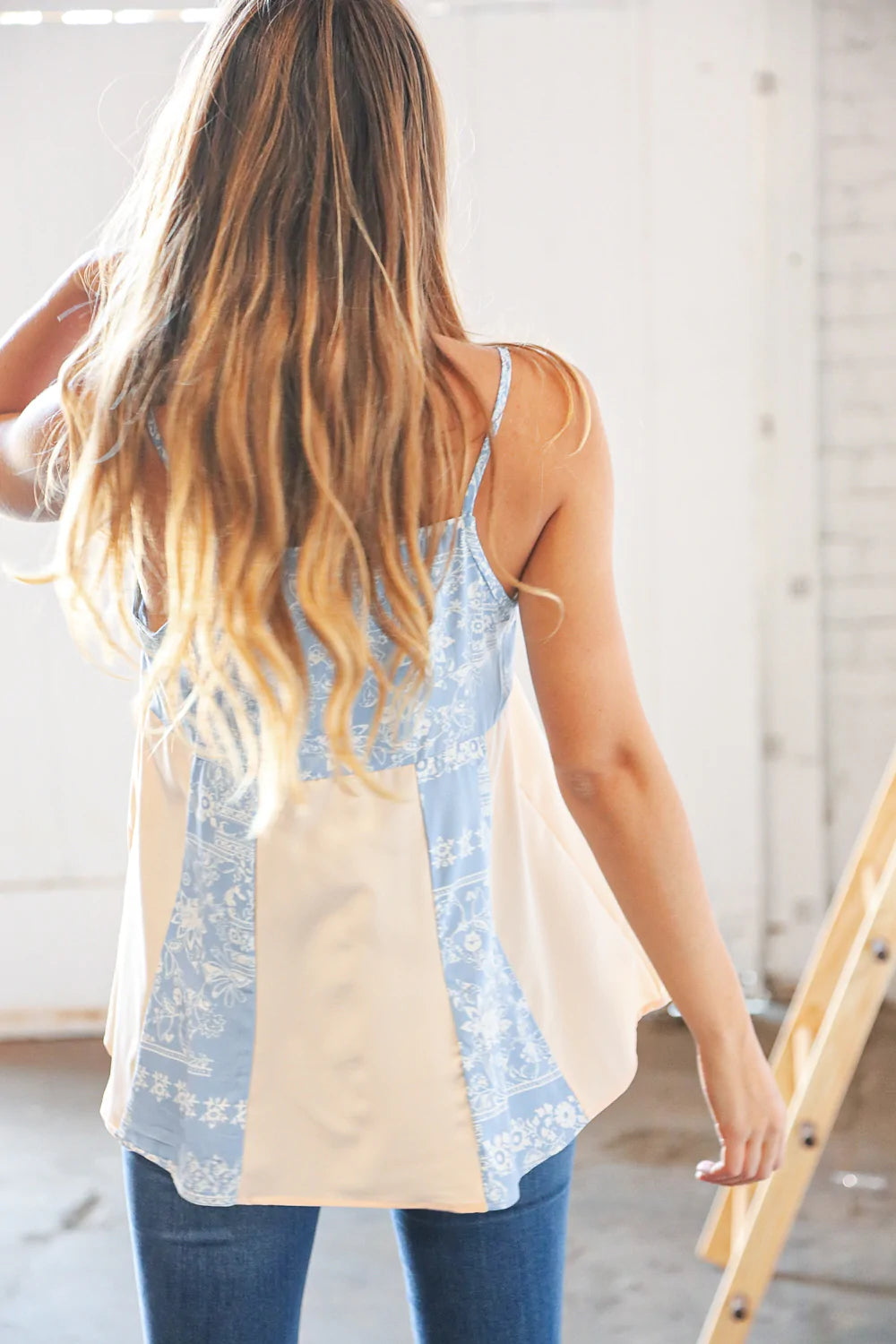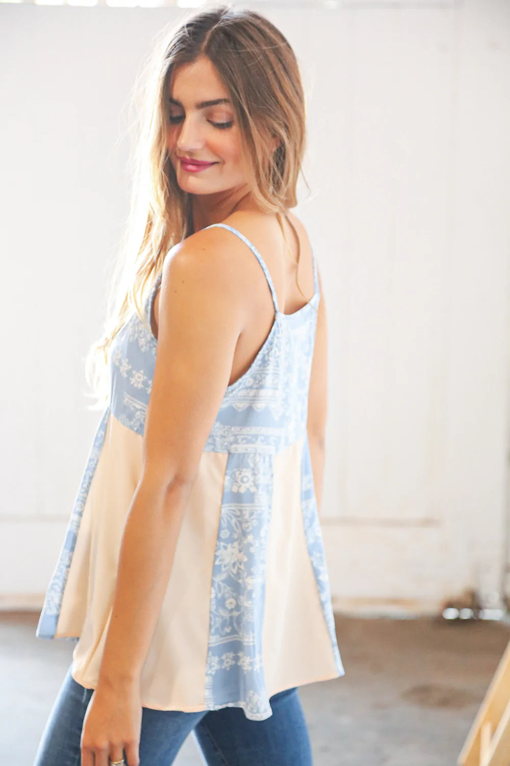 Sky Blue Tan Boho Floral Color Block Sleeveless Top