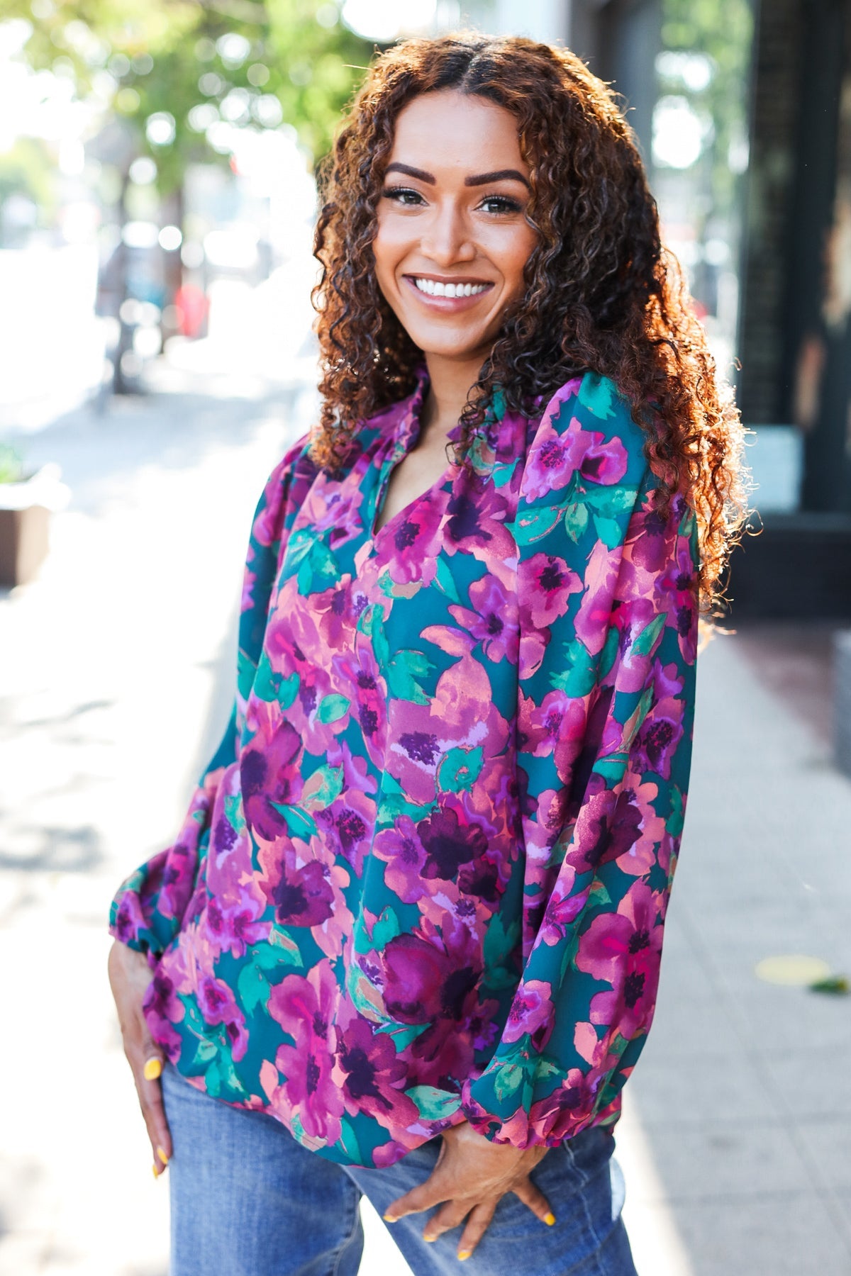 Add a pop of color to your casual closet while adding a touch of femininity with this magenta and hunter green watercolor floral long sleeve top with soft woven fabric. A stunning frill notch neck completes this versatile top.