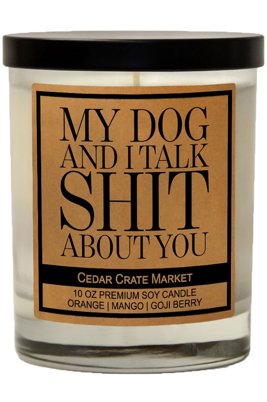 Fragrance Description: Orange, Mango, Goji Berry The aromatic scent of ripe oranges and patchouli will fill your home with notes of Goji Berry and ripe mango. A Overview: "My Dog and I Talk Shit About You" Orange Zest scent in a 14 ounce reusable glass container with black lid. Fill Weight: 10 ounces. 100% All-Natural Soy Candle Hand Poured.