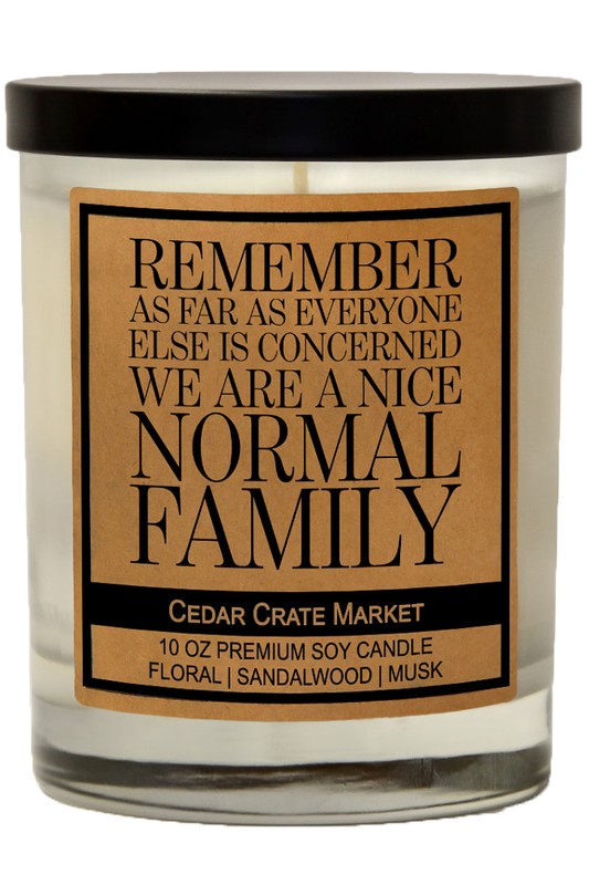 Fragrance Description: Floral, Sandalwood, Musk The scent of ocean air combined with driftwood creates a delightful aroma that fills your home with notes of citrus, cedar, floral, sandalwood and musk. Overview: "Remember As Far As Everyone Else Is Concerned, We Are a Nice Normal Family" Ocean Rose scent in a 14 ounce glass container with black lid. Fill Weight: 10 ounces. 100% Soy Candle.