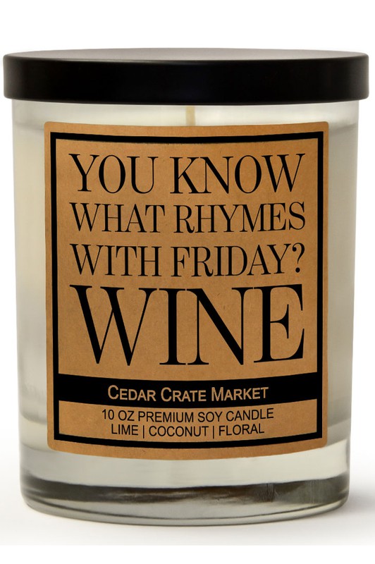 Fragrance Description: Lime, Coconut, Floral The fresh scent of lime and coconut will instantly transform any room into a tropical retreat. Overview: "You Know What Rhymes With Friday? Wine" Island Coconut Lime Scent in a 14 ounce reusable glass container with black lid. Fill Weight: 10 ounces. 100% All-Natural Soy Candle Hand Poured.